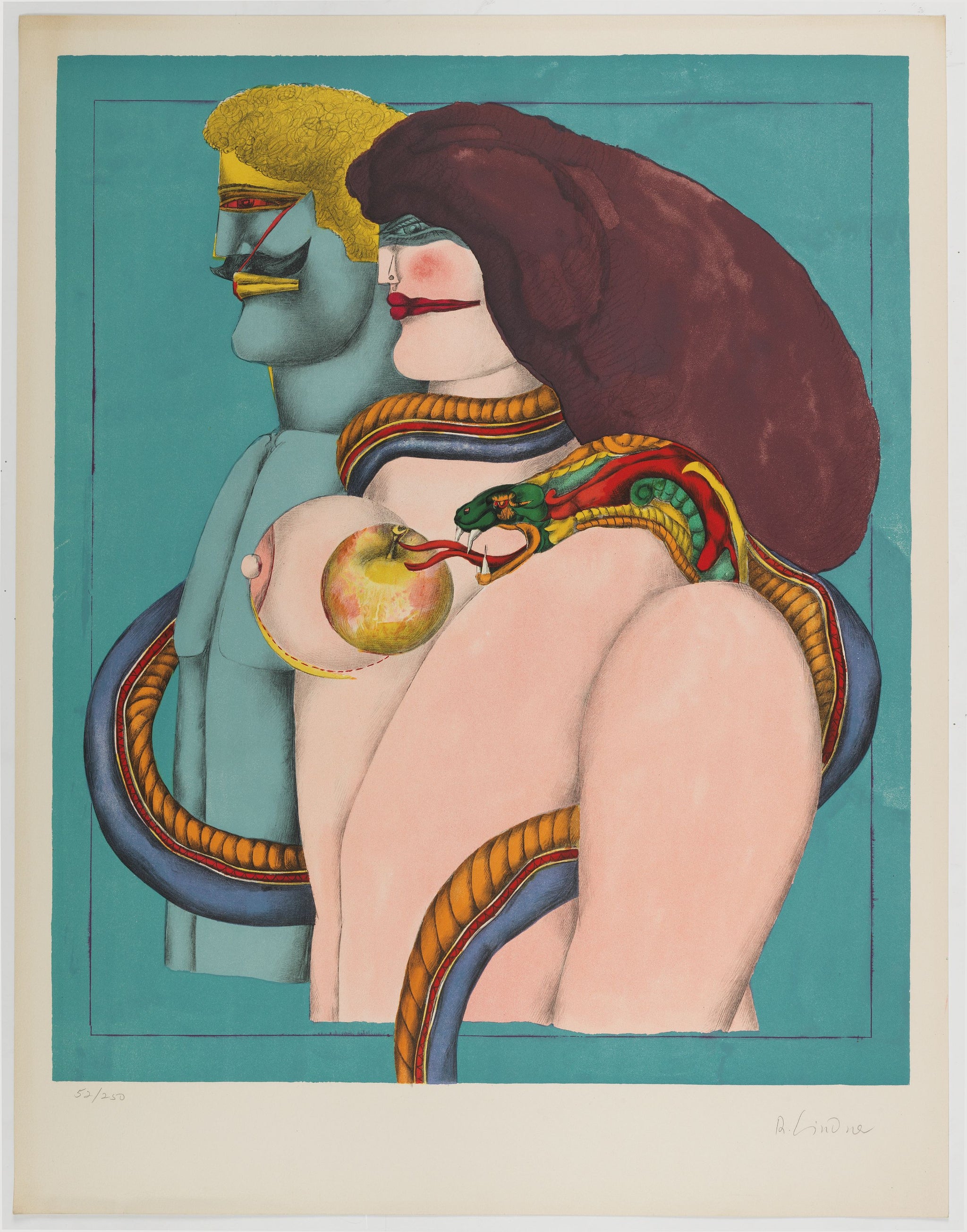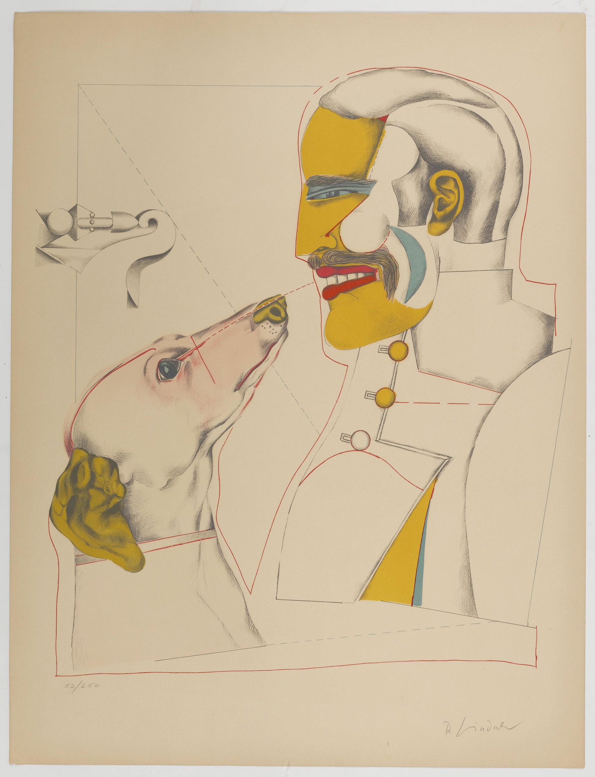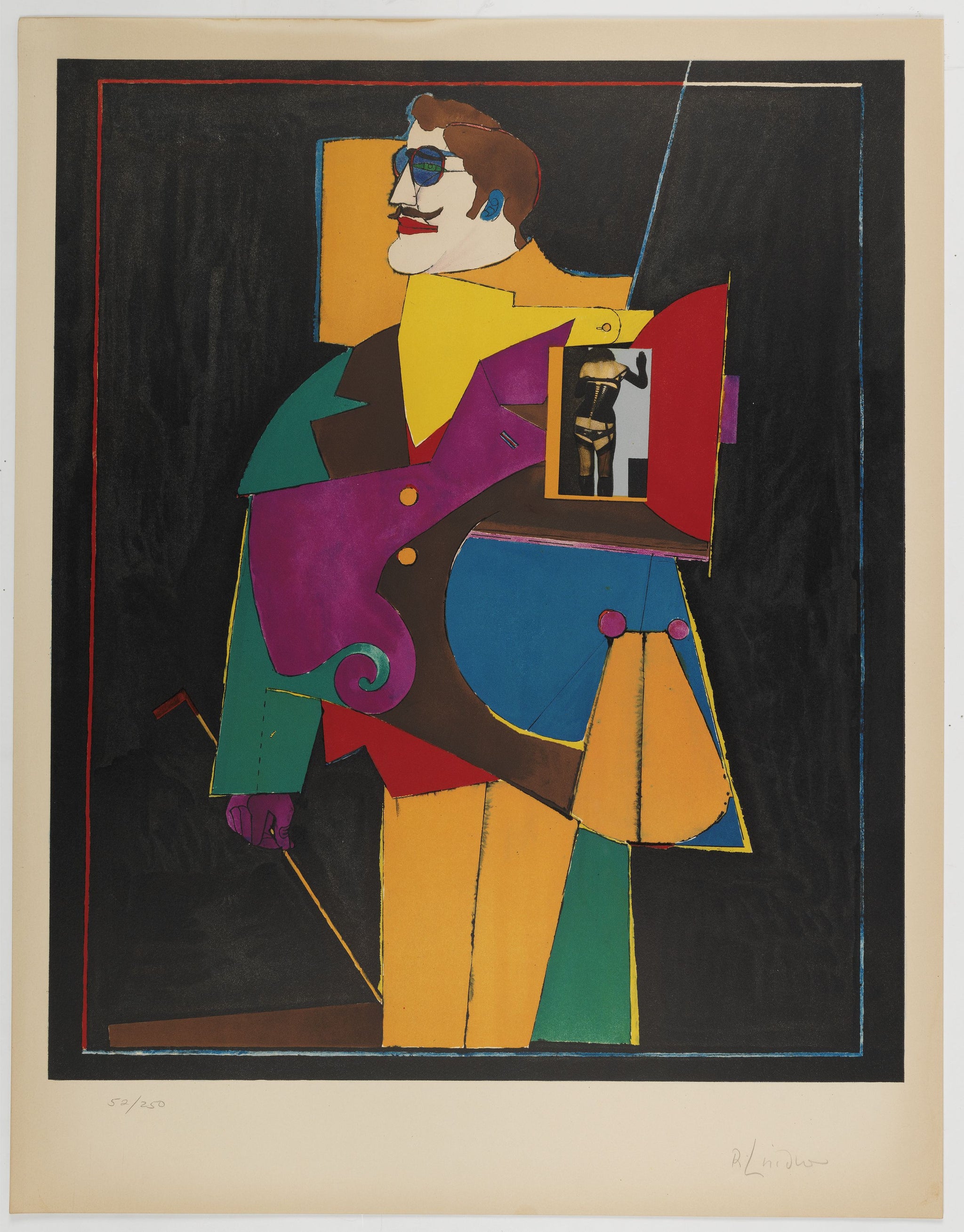 Imprimées par Shorewood Atelier, à New York. Belles épreuves d'une édition à 250 exemplaires, avec marges, toutes numérotées "52/250" et signées au crayon gris par l'artiste. Titres de chaque pièce: Portrait n°1, Portrait n°2, The Heart, Pillow and almost a Circle, Profile, Man's Best friend, How it began & Miss American Indian. Richard Lindner, né à Hambourg en 1901, fuit l’Allemagne à la montée au pouvoir d’Hitler en 1941 pour rejoindre la France puis quitte l’Europe pour les Etats-Unis. Influencé par l’expressionnisme allemand, son art interroge la sexualité et le rapport dépend de l’homme envers la femme. À partir des années 1960, Lindner trouve son style, se libère et excelle sur de grands formats avec des couleurs vives et transparentes. Ces personnages, hommes et femmes, au symbolisme flagrant, ont des accessoires qui expriment très nettement une connotation sexuelle et un questionnement autour de la sexualité tout en faisant preuve d'une certaine réserve. Il acquiert dans le monde de l'art new-yorkais, une place à part, avec ses thèmes personnels et ses personnages singuliers. Certains le considèrent même comme le précurseur du Pop Art. |
