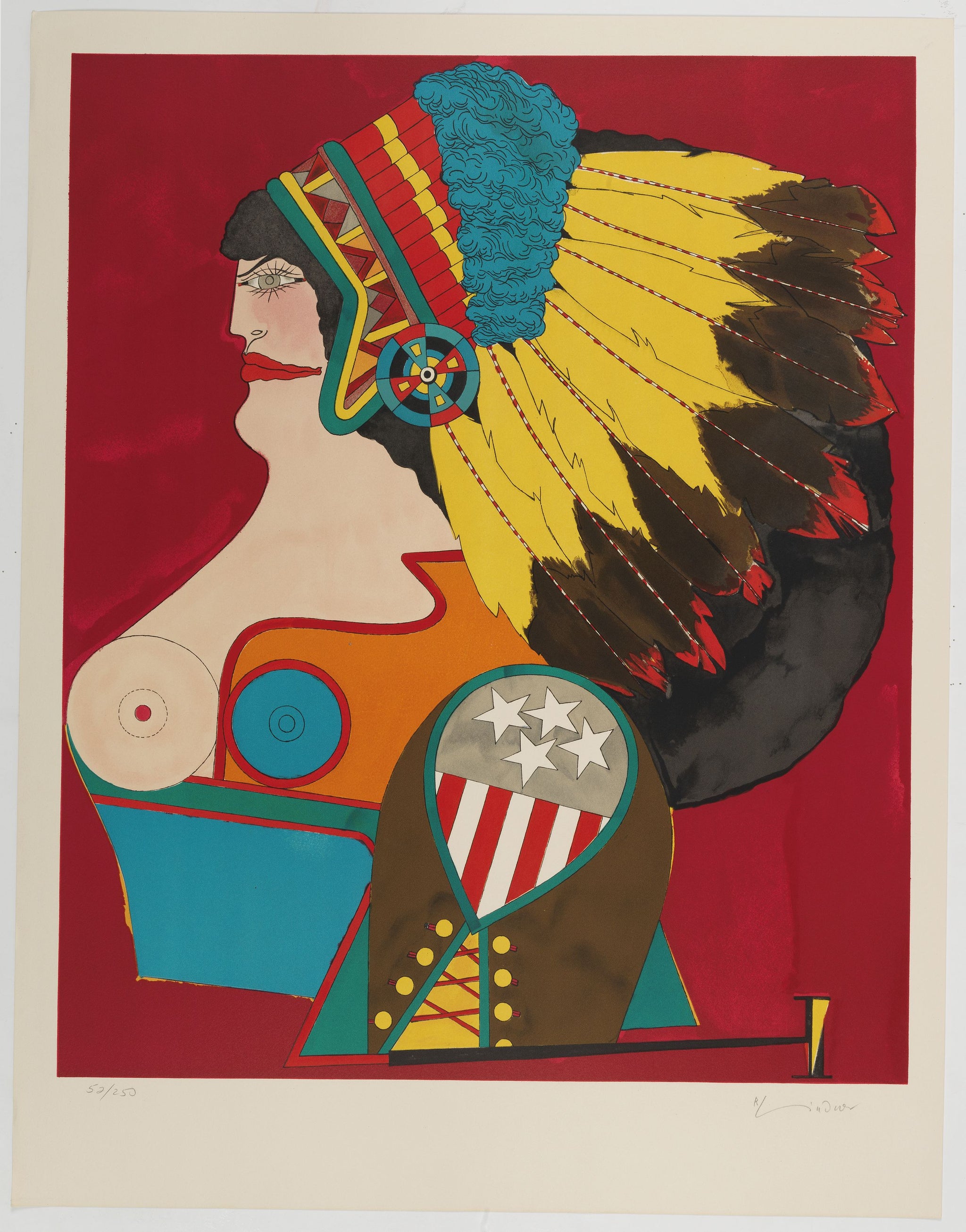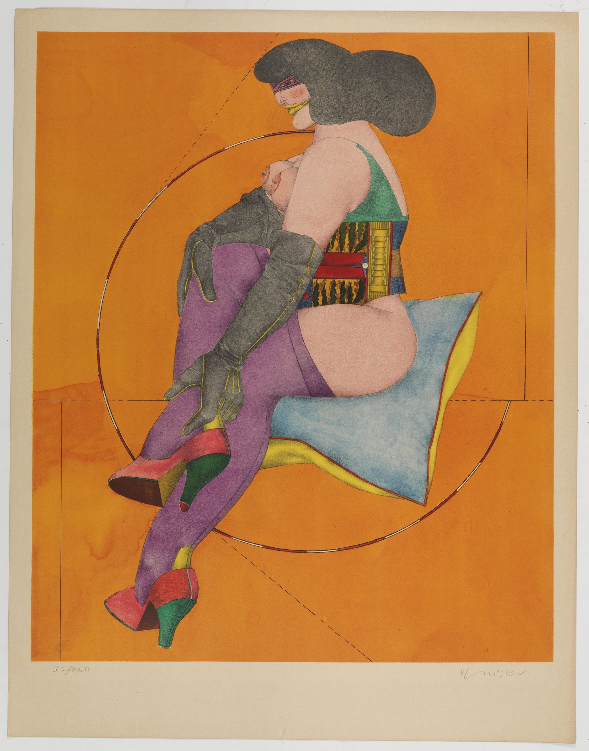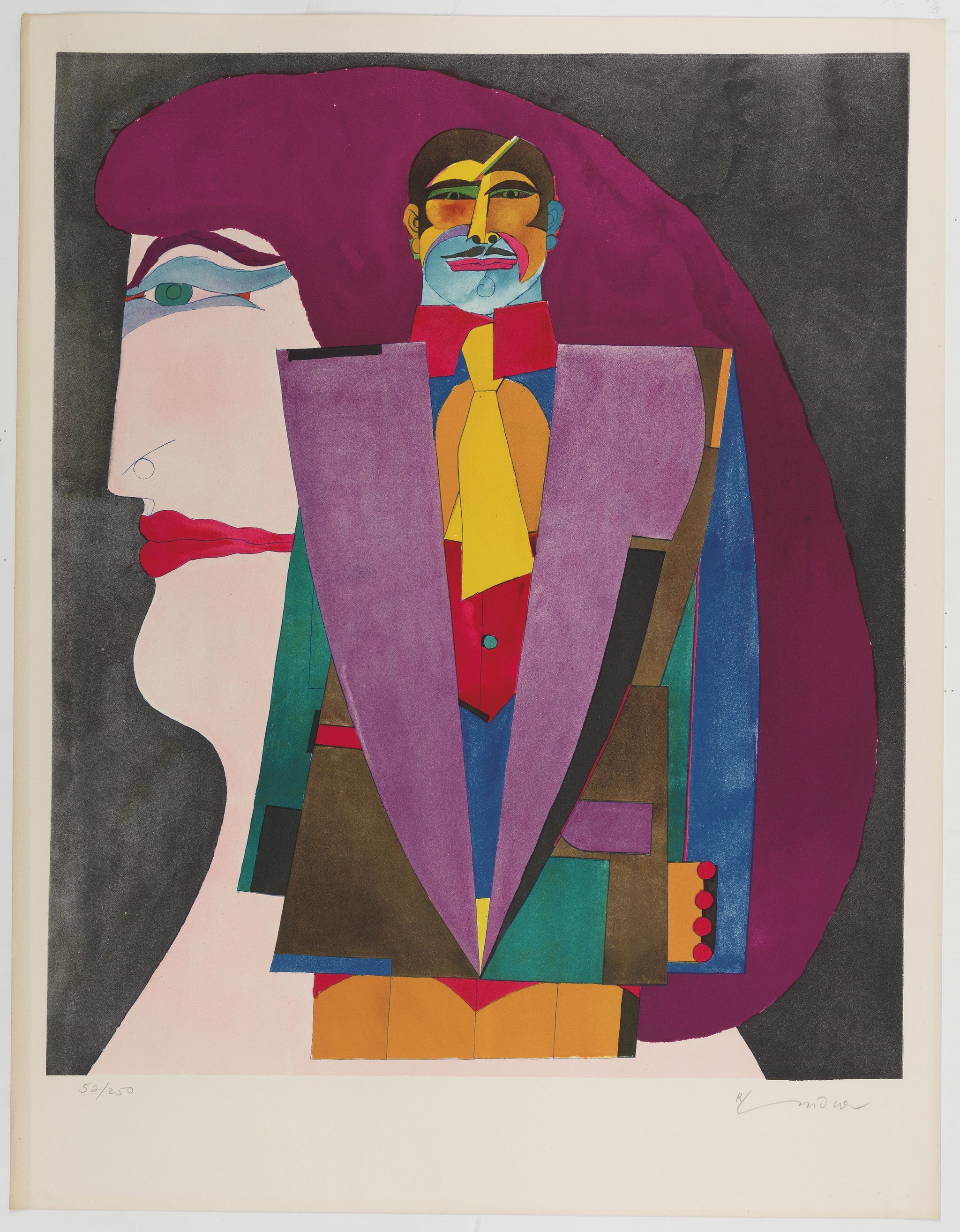 Imprimées par Shorewood Atelier, à New York. Belles épreuves d'une édition à 250 exemplaires, avec marges, toutes numérotées "52/250" et signées au crayon gris par l'artiste. Titres de chaque pièce: Portrait n°1, Portrait n°2, The Heart, Pillow and almost a Circle, Profile, Man's Best friend, How it began & Miss American Indian. Richard Lindner, né à Hambourg en 1901, fuit l’Allemagne à la montée au pouvoir d’Hitler en 1941 pour rejoindre la France puis quitte l’Europe pour les Etats-Unis. Influencé par l’expressionnisme allemand, son art interroge la sexualité et le rapport dépend de l’homme envers la femme. À partir des années 1960, Lindner trouve son style, se libère et excelle sur de grands formats avec des couleurs vives et transparentes. Ces personnages, hommes et femmes, au symbolisme flagrant, ont des accessoires qui expriment très nettement une connotation sexuelle et un questionnement autour de la sexualité tout en faisant preuve d'une certaine réserve. Il acquiert dans le monde de l'art new-yorkais, une place à part, avec ses thèmes personnels et ses personnages singuliers. Certains le considèrent même comme le précurseur du Pop Art. |