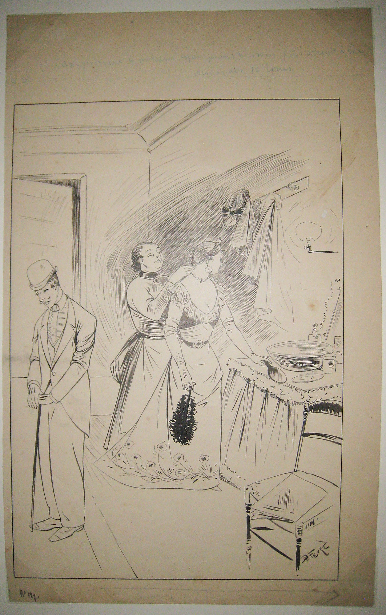 Numéroté 127 à la mine de plomb en bas à gauche. Titré au crayon bleu au-dessus du sujet et signé à l'encre par l'artiste en bas à droite. Dessin préparatoire à l'illustration publiée dans "Fin de Siècle" le 13 juillet 1892. |