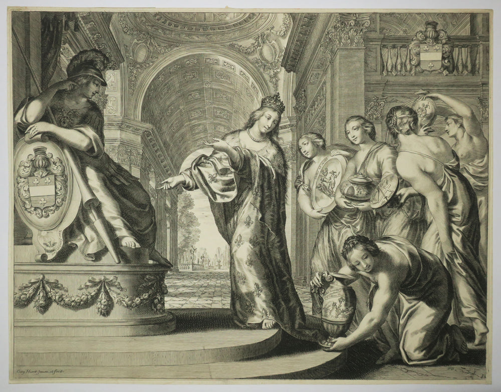 Belle épreuve, sans texte, à petites marges. Pièce allégorique à la gloire de Mr le 1er Président de Bellièvre (Paris 1583-1650), conseiller au Parlement de Paris en 1602 et Premier président à mortier du Parlement de Paris en 1614. . |