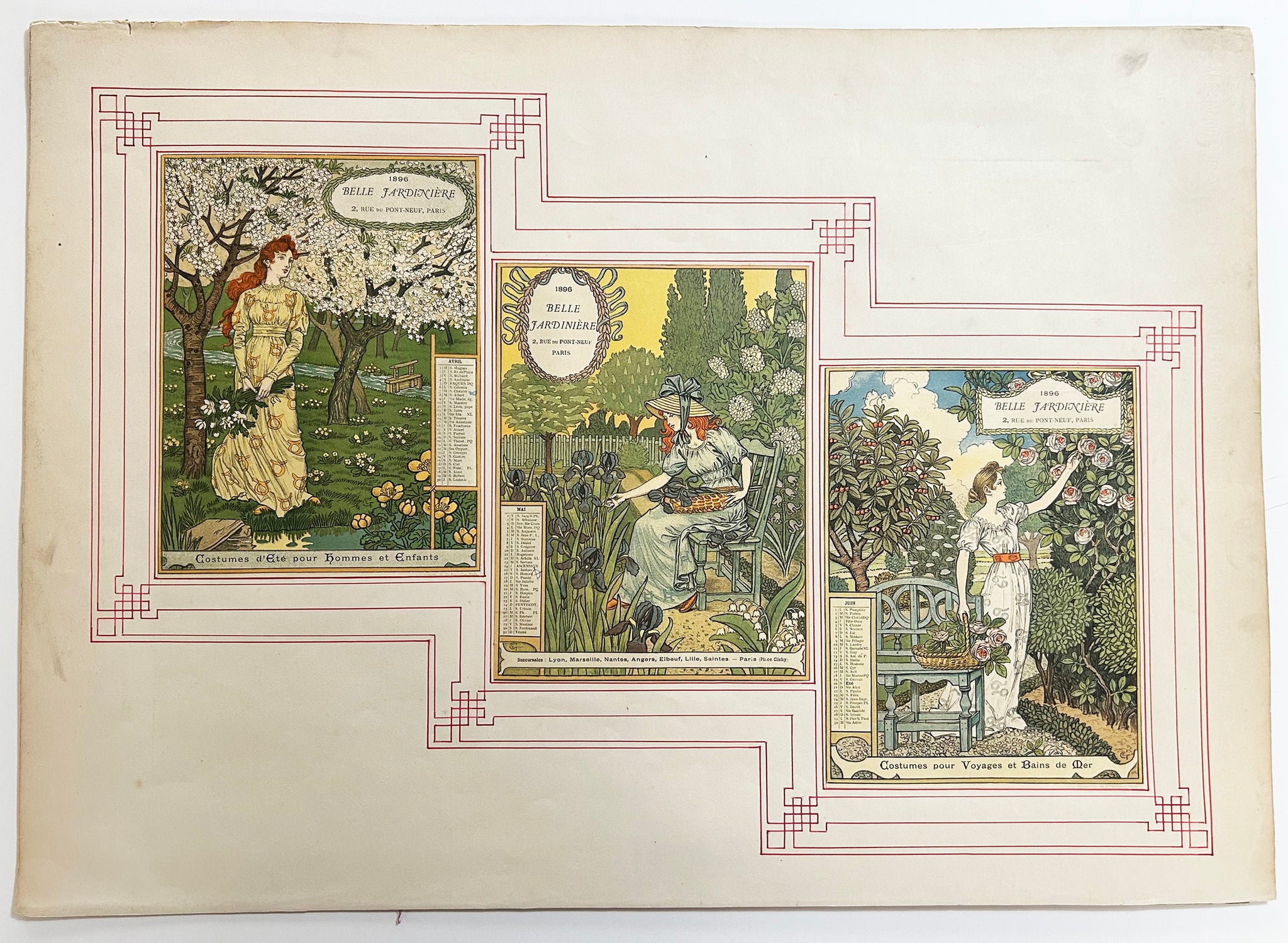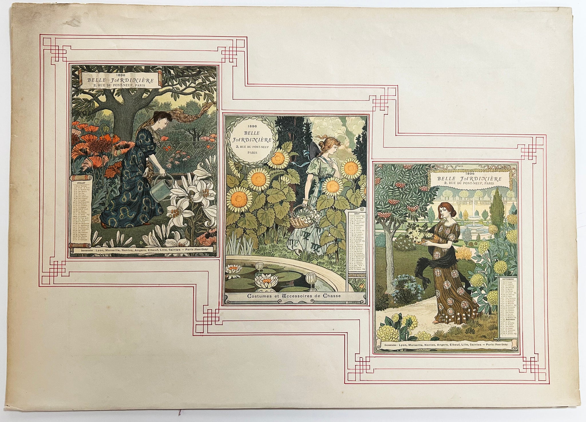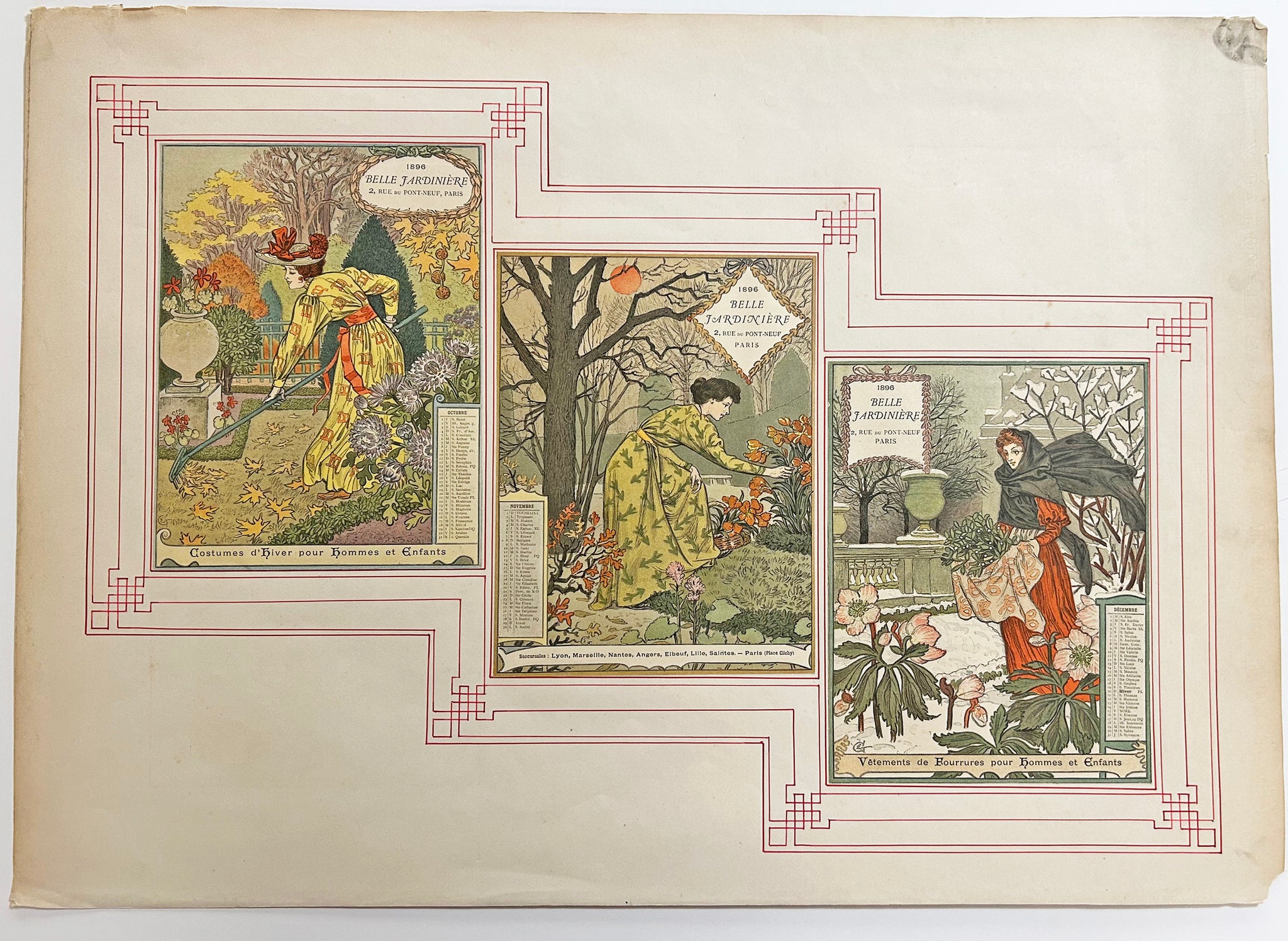 Signées du monogramme de l'artiste dans les planches. Tirage avec la lettre, publié par G. de Malherbe à Paris. Ce calendrier proposant des figures féminines afférées au jardin au fil des saisons a été réalisé pour "La Belle Jardinière", un grand magasin mythique au XIXe siècle qui se situait au 2 rue du Pont Neuf à Paris. Chaque robe que porte la femme au jardin est agrémentée de motifs symbolisant le signe du zodiaque du mois. |