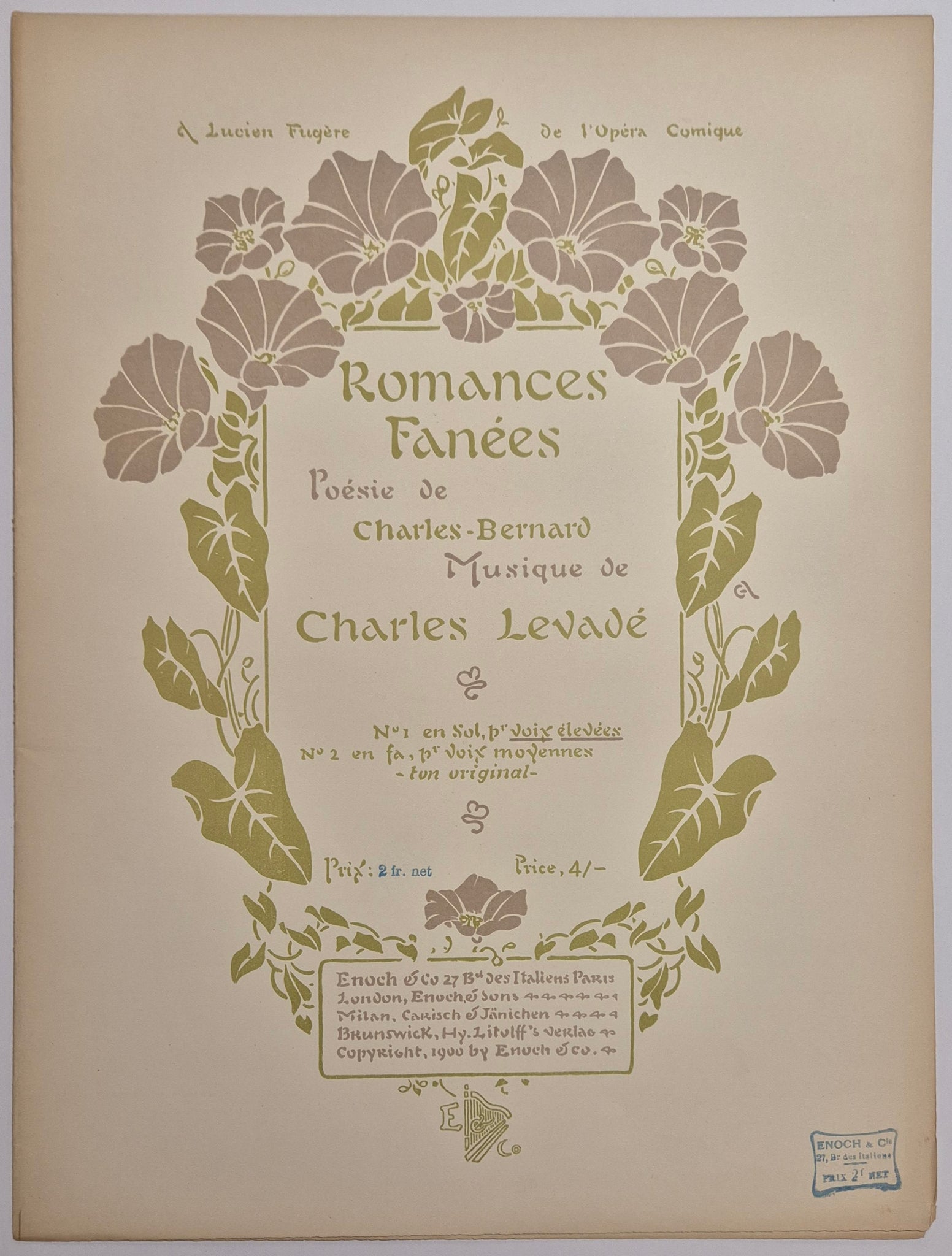 Couverture pour partition, au format in-folio. Lithographie en couleurs par George AURIOL (1863-1938), avec son monogramme (Leroy-Crèvecoeur n°10). Imprimée sur vélin glacé par Eugène Verneau, Paris. Prix de vente apposé au composteur par l'éditeur.
