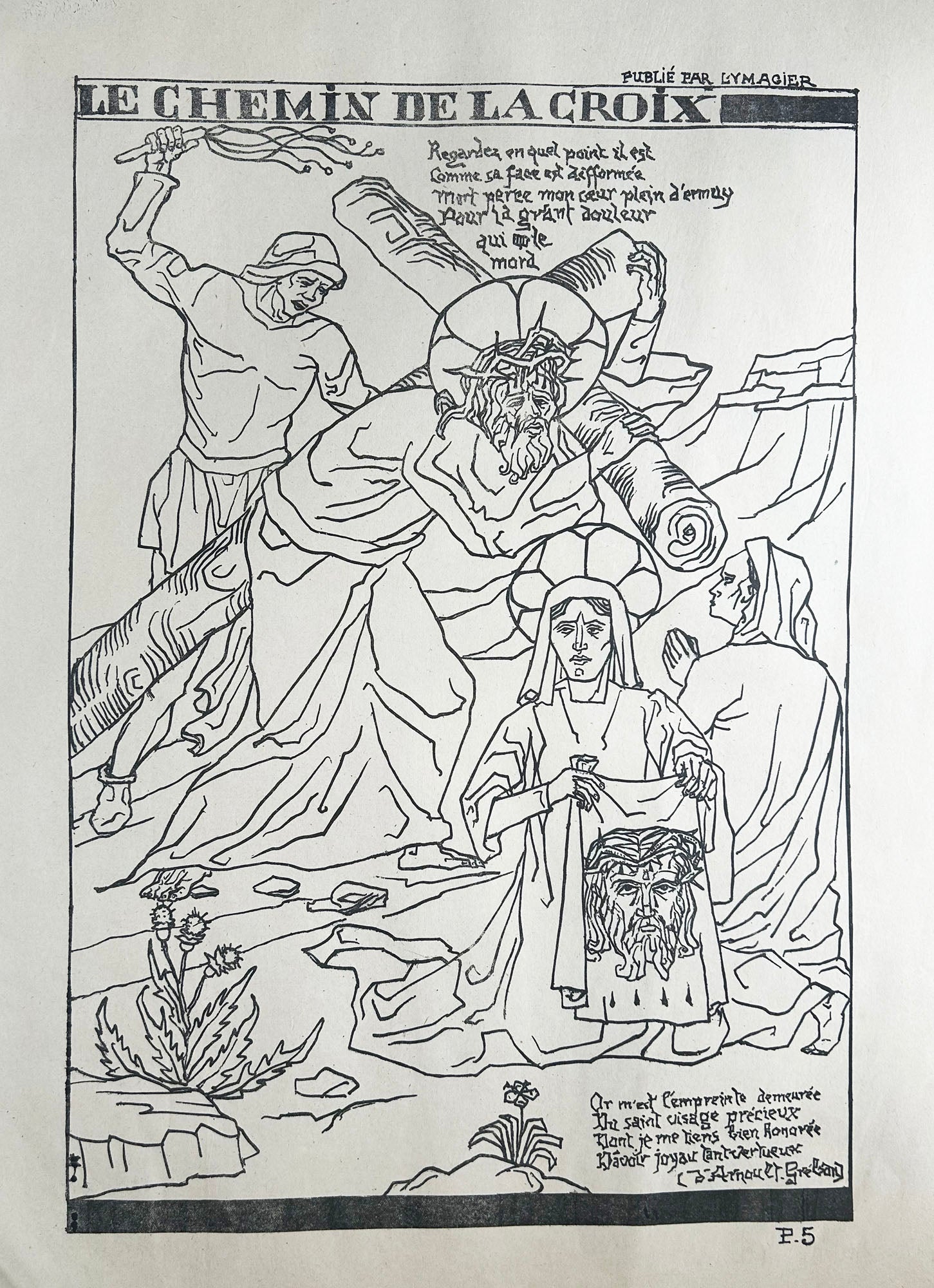 I.F.F Après 1800, non décrit. Morane, n°41 ("Si cette planche est manifestement destinée à faire partie d'un album de l'Ymagier, la signification de P.5 (en marge) n'est pas évidente. Cette estampe étant la seule à comporter une telle numérotation. Il ne s'agit pas non plus de la 5ème station du Chemin de croix, la scène représentée correspondant à la 6ème station, Véronique essuyant le visage du Christ").