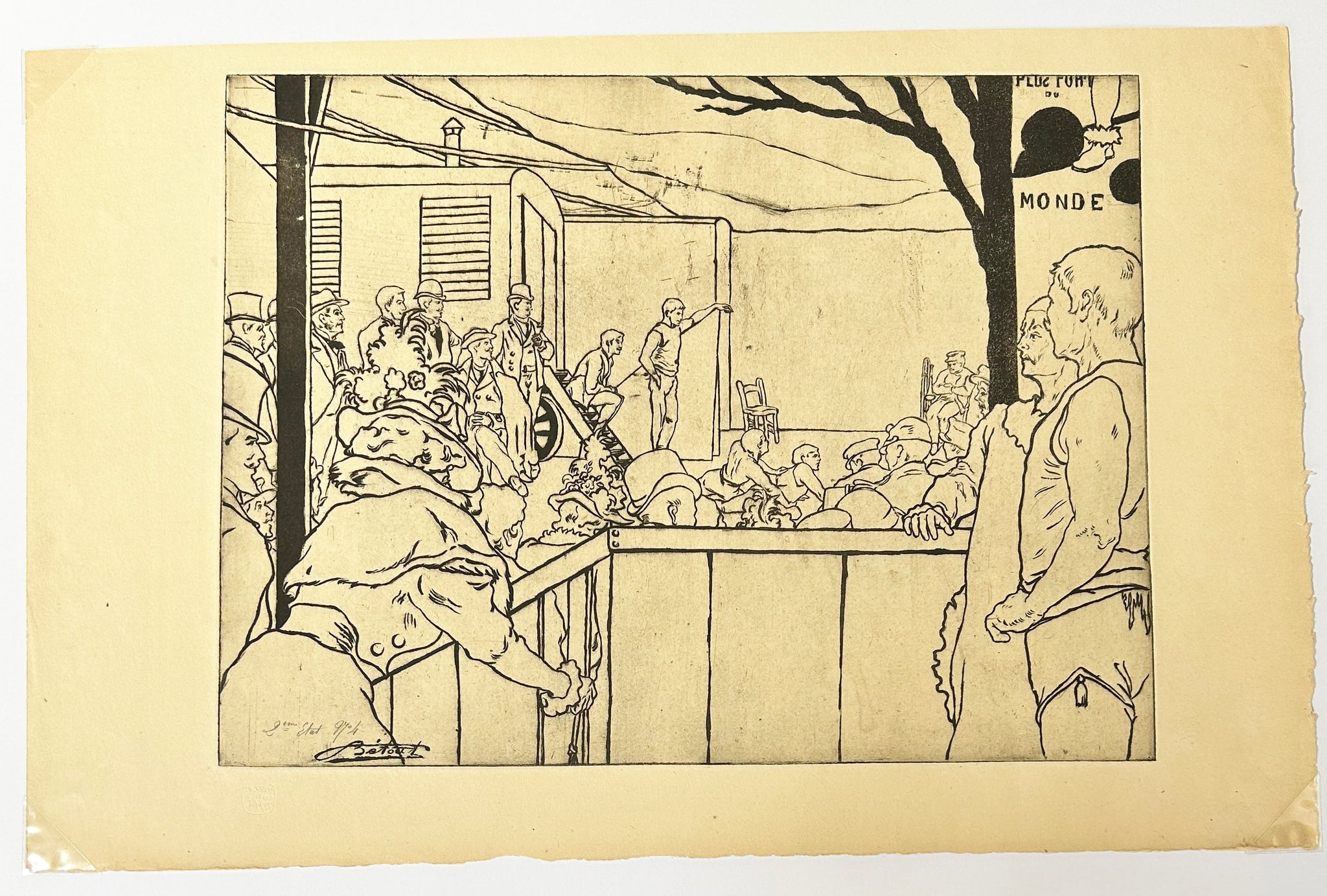 Belle et rare épreuve sur vélin, avant les fonds d'aquatinte en couleurs, justifiée au crayon "2eme Etat n°4" et signée dans la planche. Revêtue du cachet sec d'Edmond-Honoré Sagot (L.2253). Rare. |