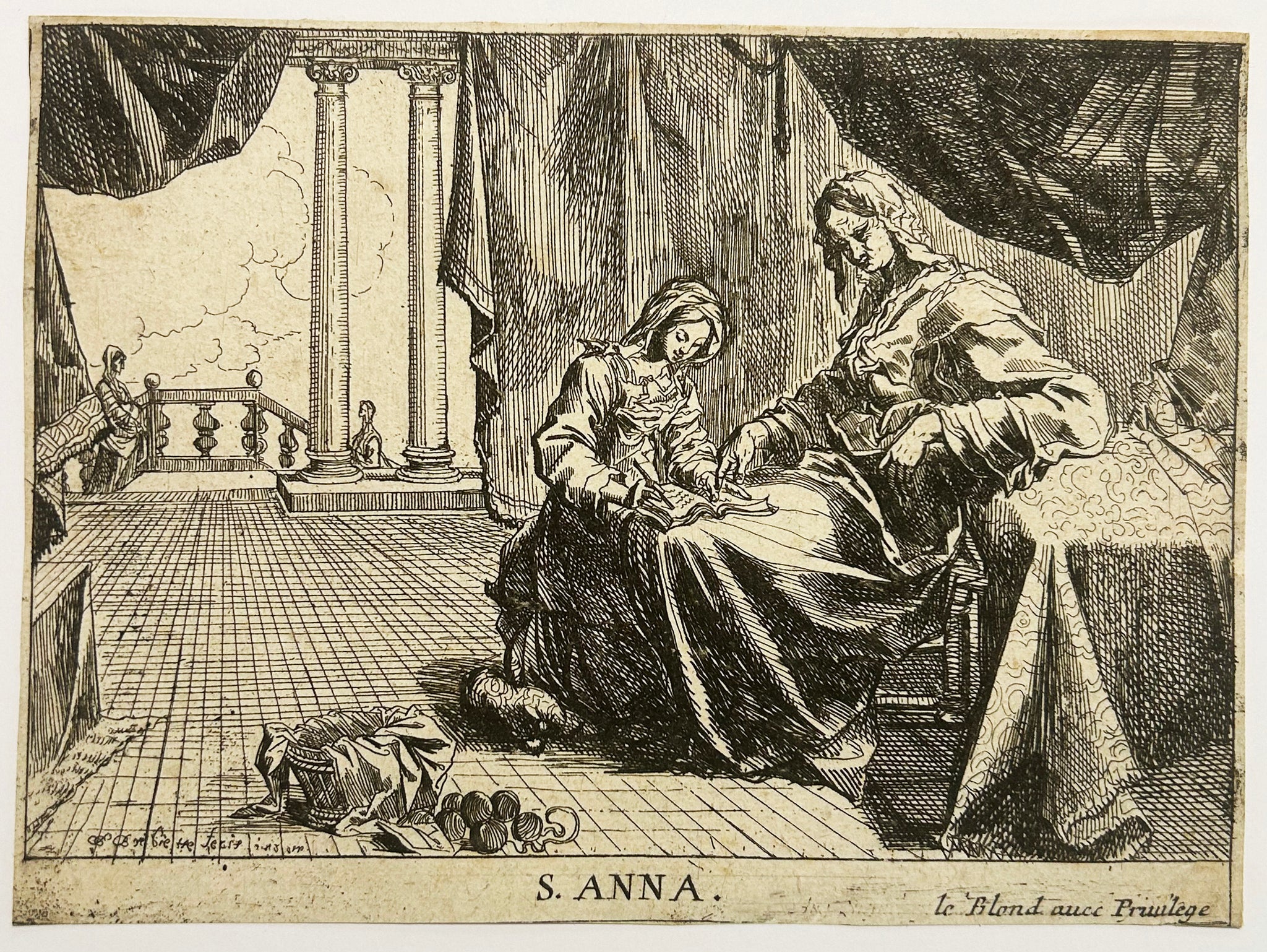 Planche de la suite de 19 compositions représentant des Saints et des Saintes. Epreuve avec la lettre et l'adresse de Le Blond remplaçant celle de "Aug. Quesnel", sur papier vergé. Petites marges du cuivre. |