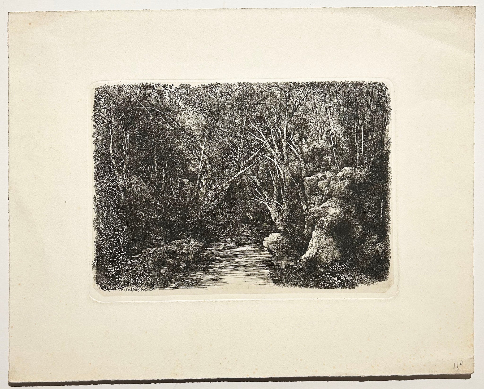 Signée (deux fois) et datée à la pointe dans la planche. Epreuve de l'état unique, sur papier chine appliqué. Bonnes marges. Belle impression. Van Gelder dit n’en connaître que quelques exemplaires et en cite 4 ou 5 dans des Cabinets d’Estampes. Le Metropolitan Museum (inv. n°51.504.45), le National Gallery of Art (Washington) (inv. n°1954.12.221) et le National Museum of Western Art (inv. n°G.2009-0026) conservent tous les trois une épreuve similaire à la nôtre. Dans cette composition "on reconnaît nettemant dans les roches se trouvant à droite du ruisseau des détails des "Baigneuses dans la montagne" (V.G, n°115). Le "Ruisseau sous bois" est en effet le résultat d'une transformation profone des "Baigneuses"" (Van Gelder). |