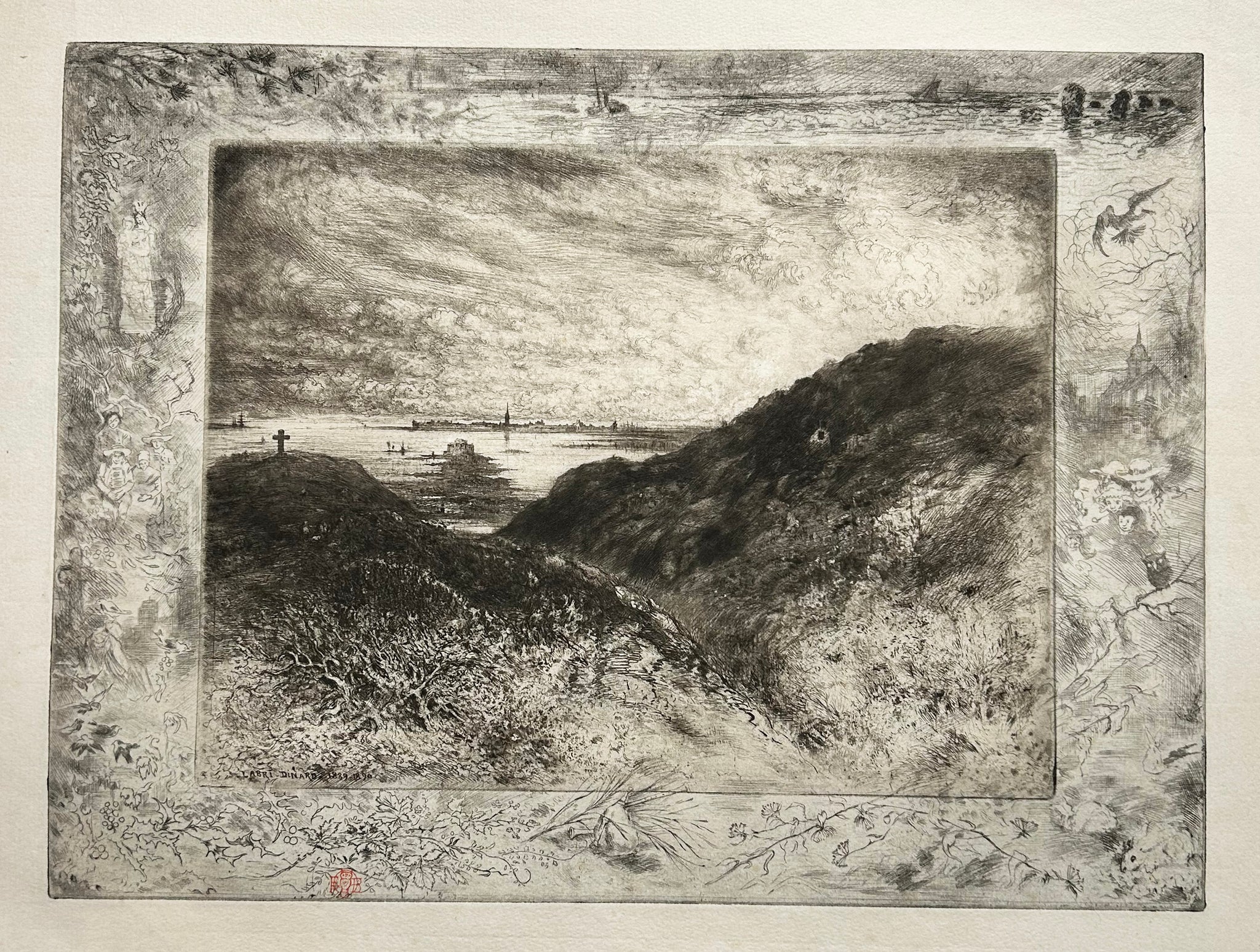 Située "L'abri - Dinard" et datée à la pointe dans la planche. Belle épreuve du cinquième état, imprimée en noir pour la composition centrale et gris pour les marges symphoniques (ii/ii), avec l’annotation « L’Abri Dinard 1889-1890 » dans l’angle inférieur gauche de la composition, après effacement du nom de l’artiste et avant la plaque rayée. Epreuve sur papier vergé filigrané (Lettres B.L dans un écu couronné surmonté d'un croissant de lune), revêtue du cachet rouge de l'artiste (Lugt 977). Bonnes marges. L'INHA conserve une épreuve similaire à la nôtre mais sur japon (inv. NUM Mfilm 347 (16, 250)). Selon Bourcard & Goodfriend, "cette estampe peut être considérée comme la dernière grande et importante pièce exécutée par l'artiste". |