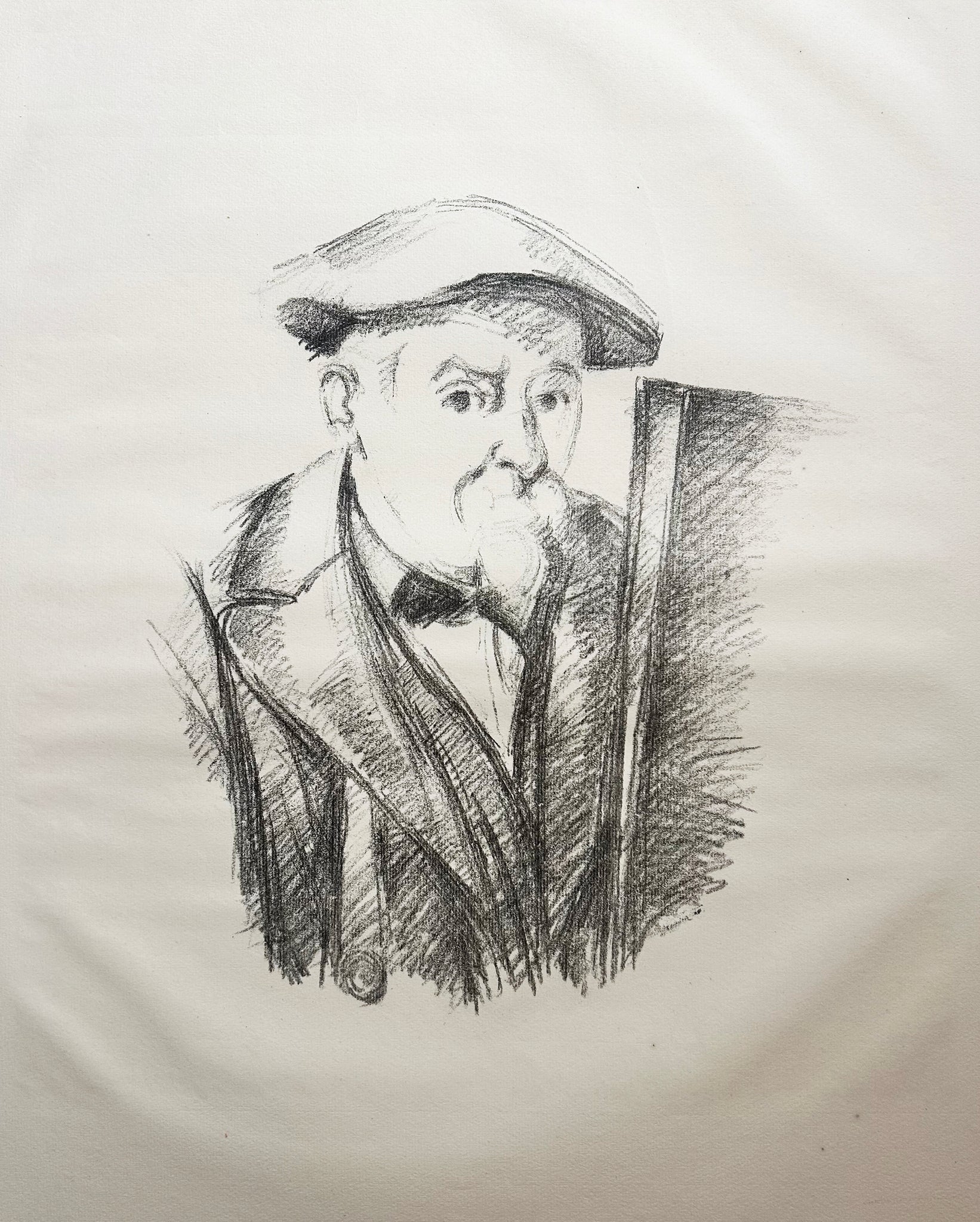 Belle épreuve avant la lettre, d'un tirage à 100 exemplaires, imprimée par Auguste Clot (Paris) sur papier vergé Ingres d'Arches. Toutes marges. Bel état de conservation. Parmi les deux cents portraits peints par Cézanne, une trentaine sont des autoportraits. Dans celui-ci, Paul Cézanne est assis devant un chevalet, regardant le côté de sa toile pour rencontrer l'œil du spectateur. On peut supposer que l’artiste s'est dessiné en se regardant dans un miroir en voulant ainsi reproduire l'image de lui-même en train de dessiner. |