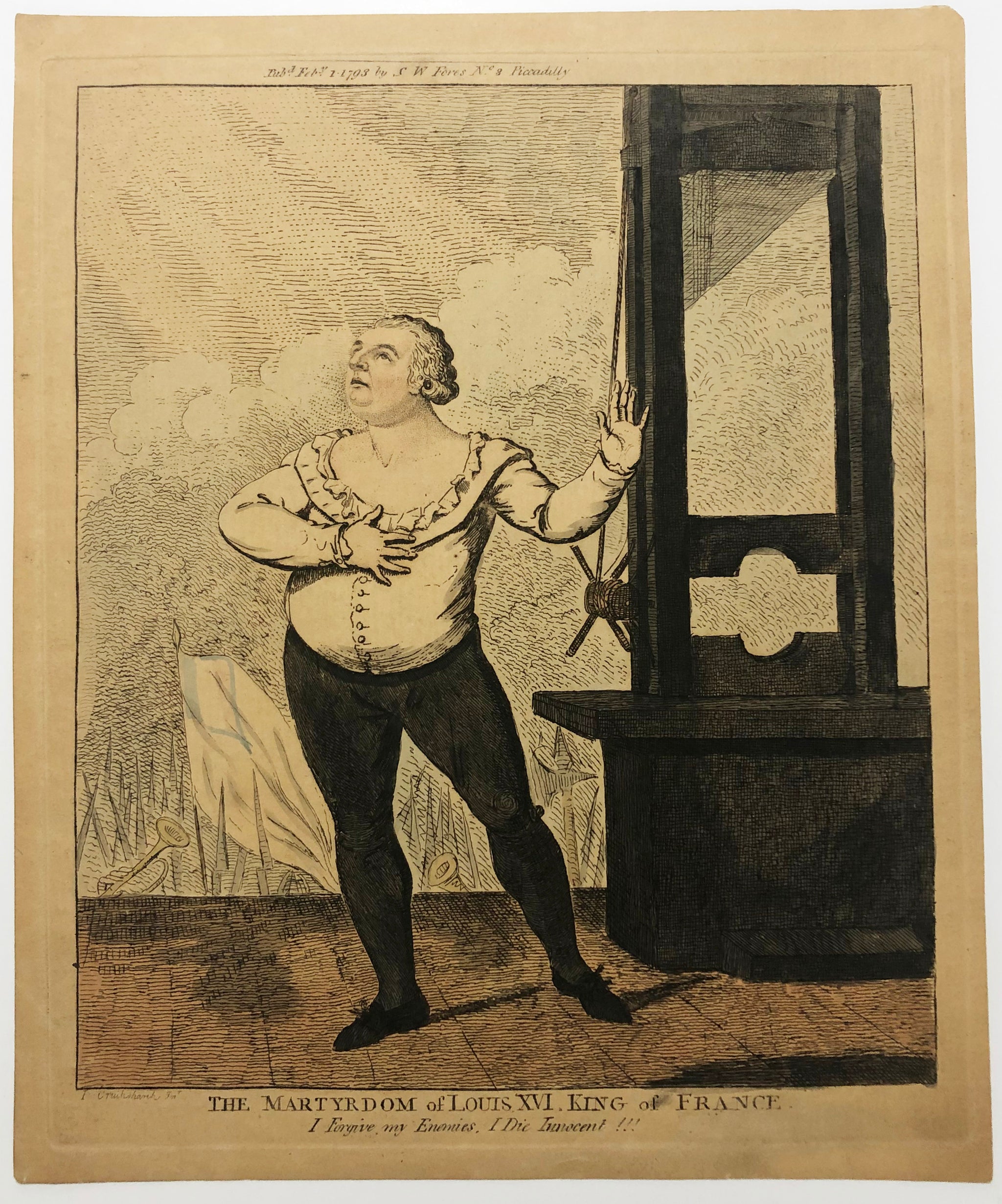 Epreuve en coloris de l'époque, sur papier vélin, publiée à Londres en 1793 chez S. W. Fores (n°3 Piccadilly). Petites marges. Composition représentant Louis XVI debout, posant de manière dramatique devant une guillotine. Epreuves connues: BNF (réserve, inv.QB-370 (31)-FT 4). British Museum (inv. Mm,15.7). |