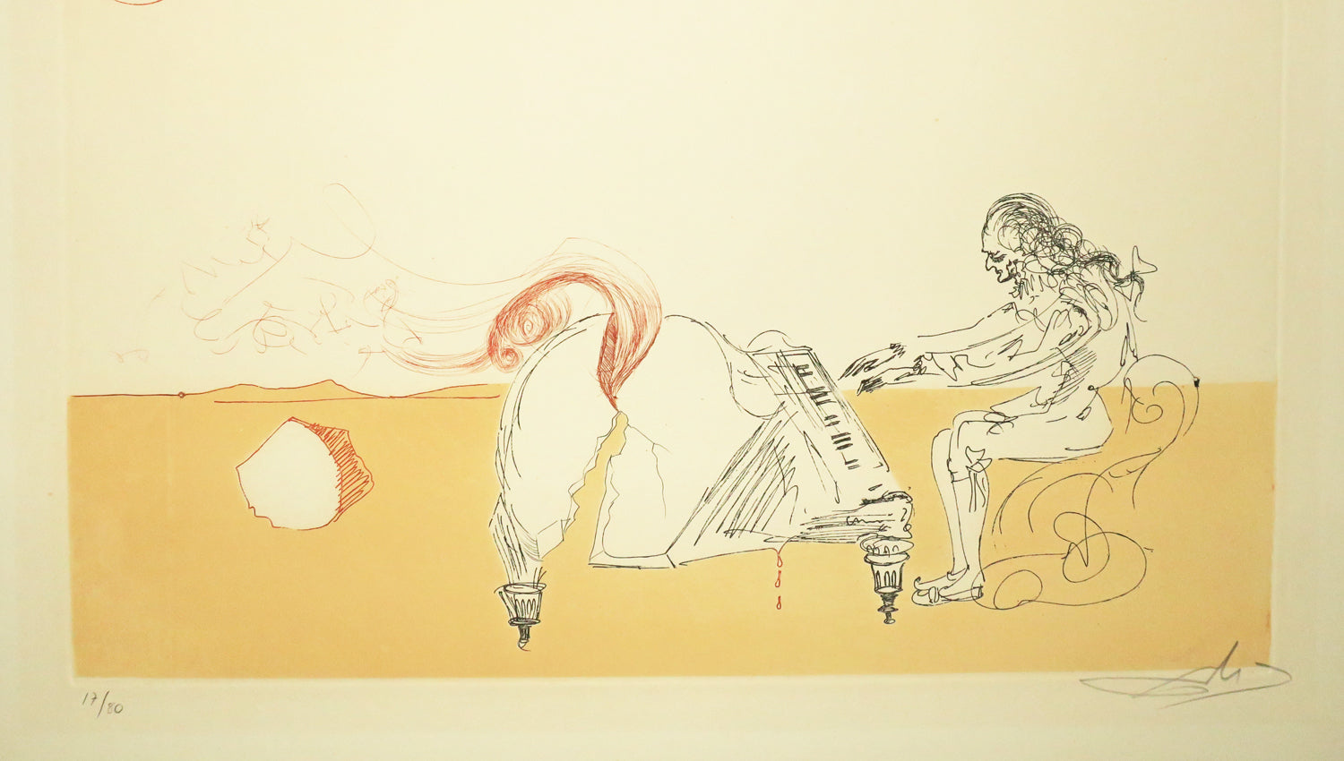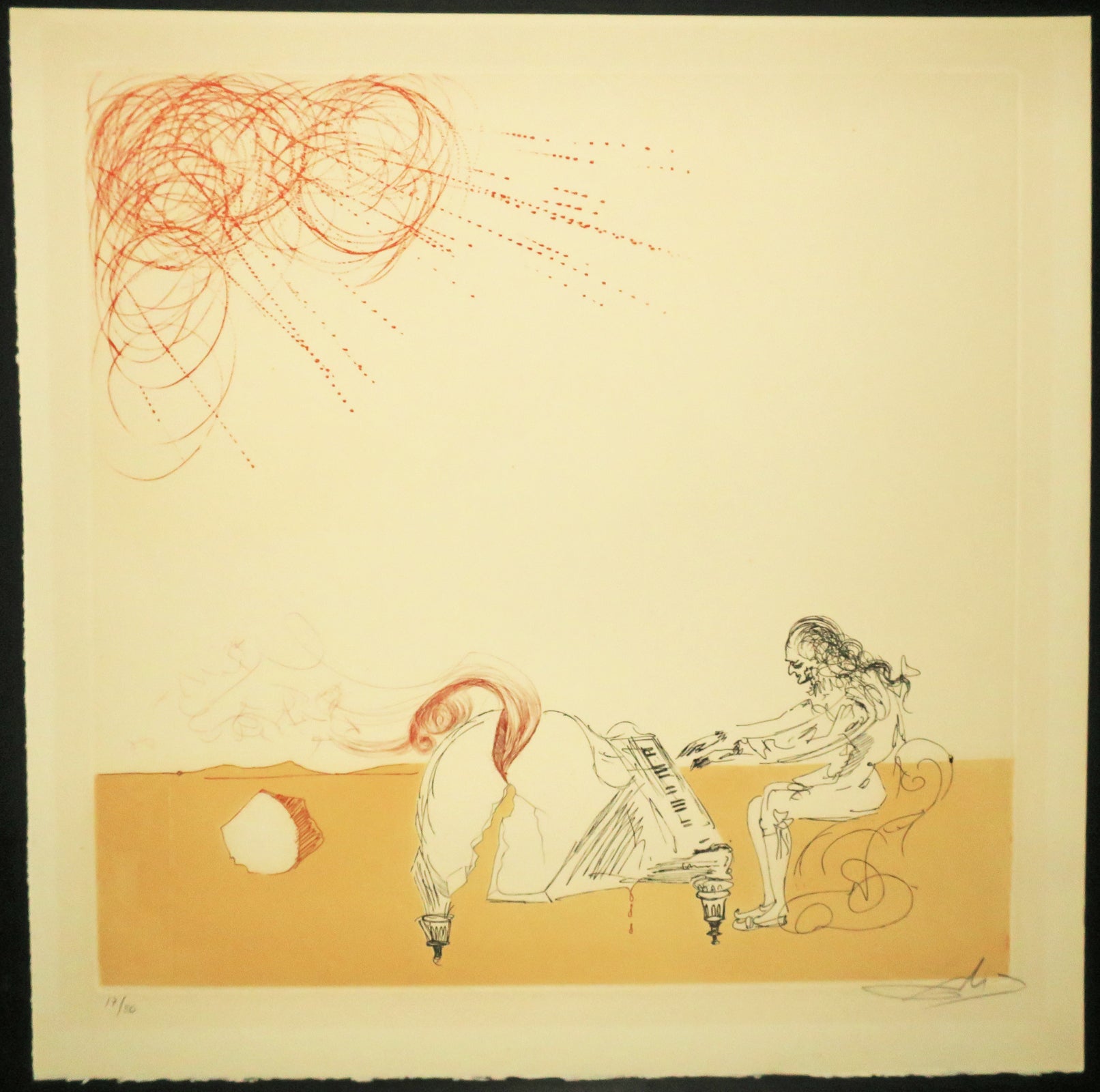 | Gravure originale à la pointe sèche et à l'aquatinte, imprimée en couleurs. |