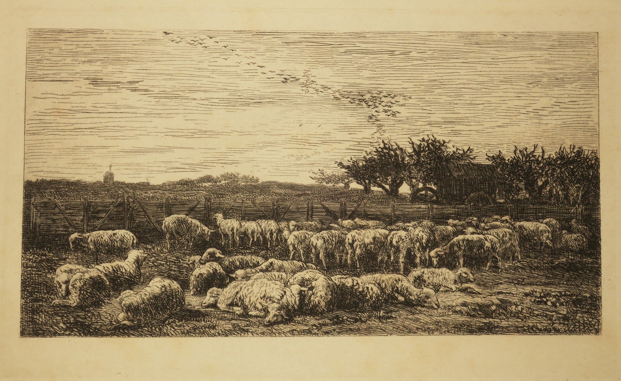 Belle épreuve de l'état définitif, sur papier Japon vergé pelure, revêtue au verso d'une marque de collection rouge non identifiée par Lugt (n°103e :"marque toujours apposée sur des eaux-fortes de Daubigny mais l'identification reste à trouver). Comme le signale Delteil, il existe des faux avant-lettre du "Grand Parc à moutons" qui ont été obtenues au moyen d'un cache ou par le non encrage de la lettre (donc sans la signature à la pointe de l'artiste dans la marge) comme c'est le cas ici pour cette épreuve. Marges. Bel état de conservation. |