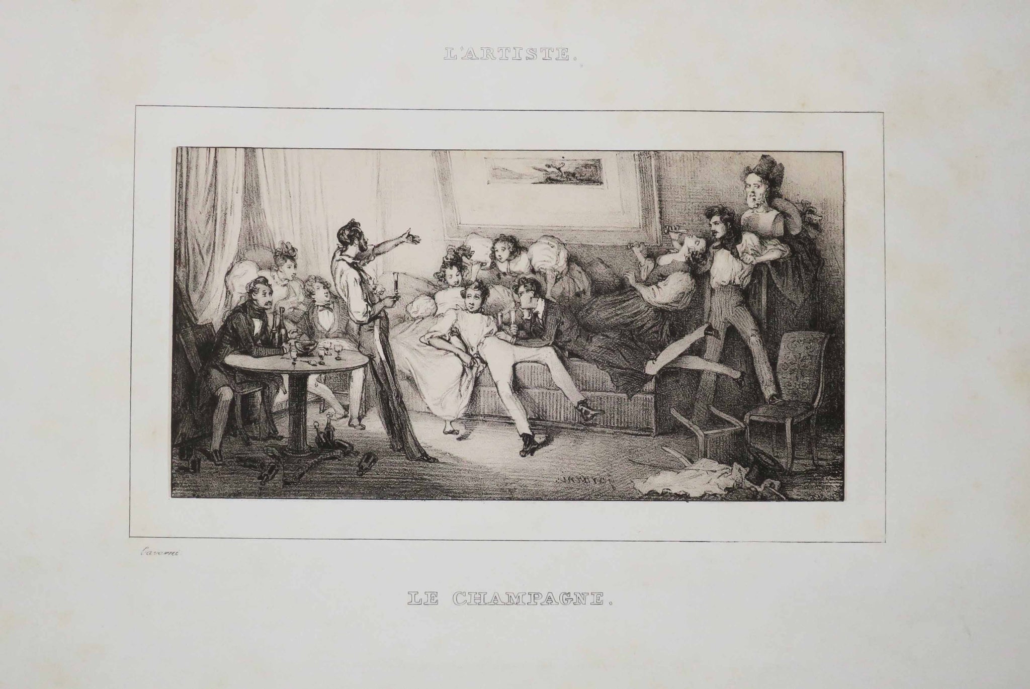 Signée en bas sur la droite dans la composition. Epreuve avec le nom de l'artiste sous le trait carré à gauche mais sans adresse d'éditeur ou d'imprimeur, sur papier Chine appliqué, publiée dans "L'Artiste". Sujet représentant une orgie à laquelle se livrent six jeunes gens en compagnie de quatre femmes. L'un d'eux, en manches de chemise, pérore debout, appuyé contre un guéridon placé derrière lui. Dans le fond, plusieurs autres hommes ou femmes, assis ou étendus sur un divan et tenant des verres de vin de Champagne. |