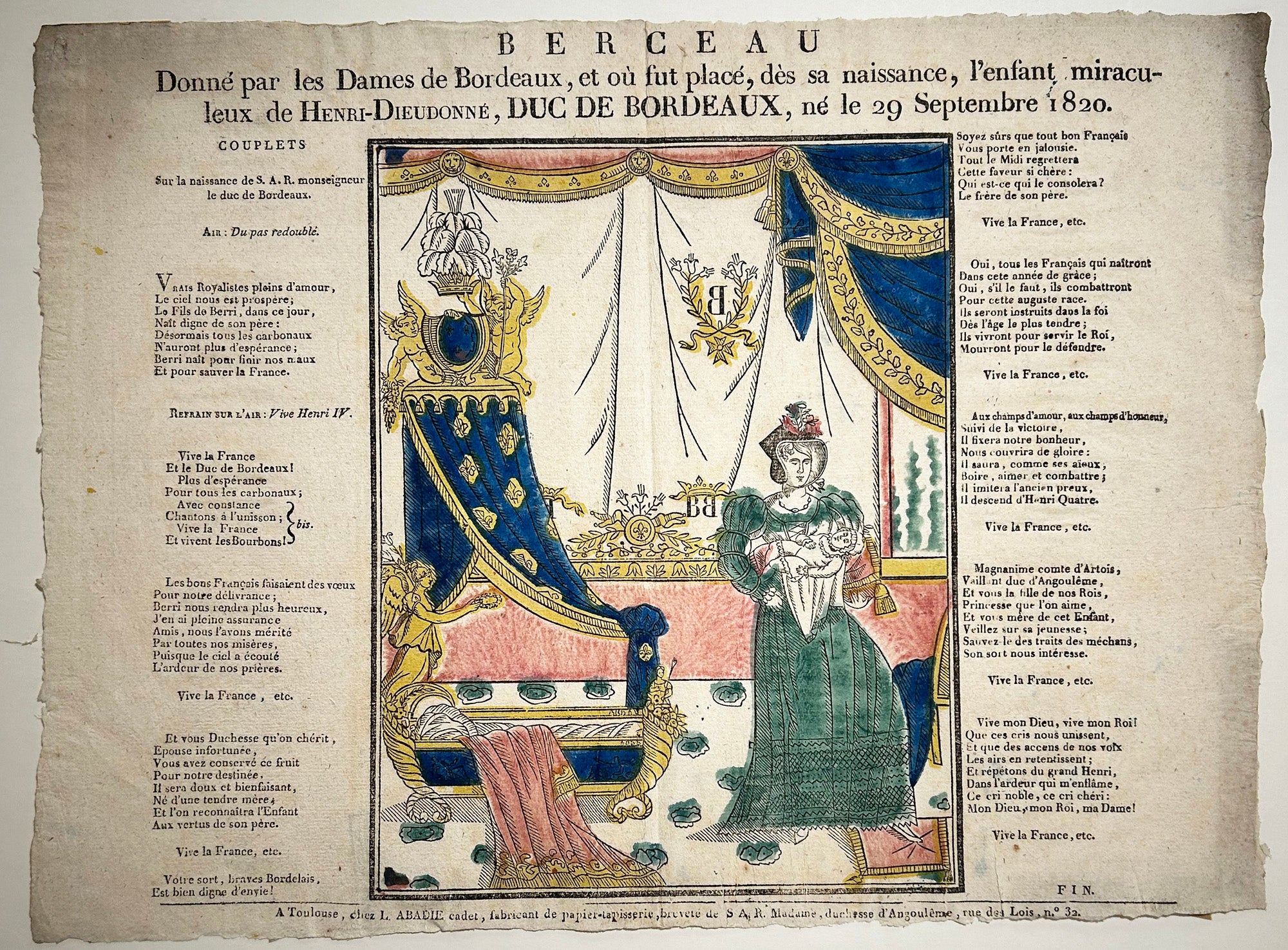 Epreuve sur papier vergé, avec l'adresse "A Toulouse, chez L. Abadie cadet, fabricant de papier-tapisserie, breveté par S.A.R. Madame, duchesse d'Angoulême, rue des Lois, n°32. Revêtue au verso de la marque de collection de Louis Ferrand (Lugt non décrit). Marges. |