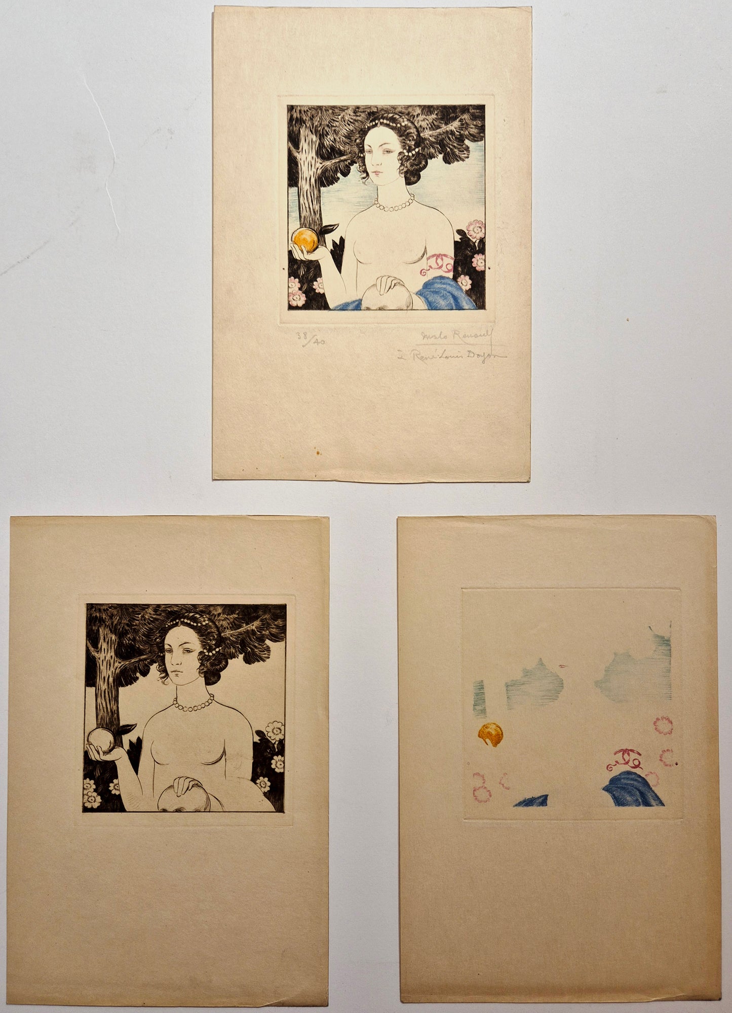 Belle épreuve sur papier simili-japon, signée, numérotée 38/40 et dédicacée à René-Louis Doyon (1885-1966), écrivain, éditeur, libraire français. On y joint une décomposition des couleurs, une épreuve en noir et une seconde avec la planche des couleurs. Bonnes marges pour chacune. |
