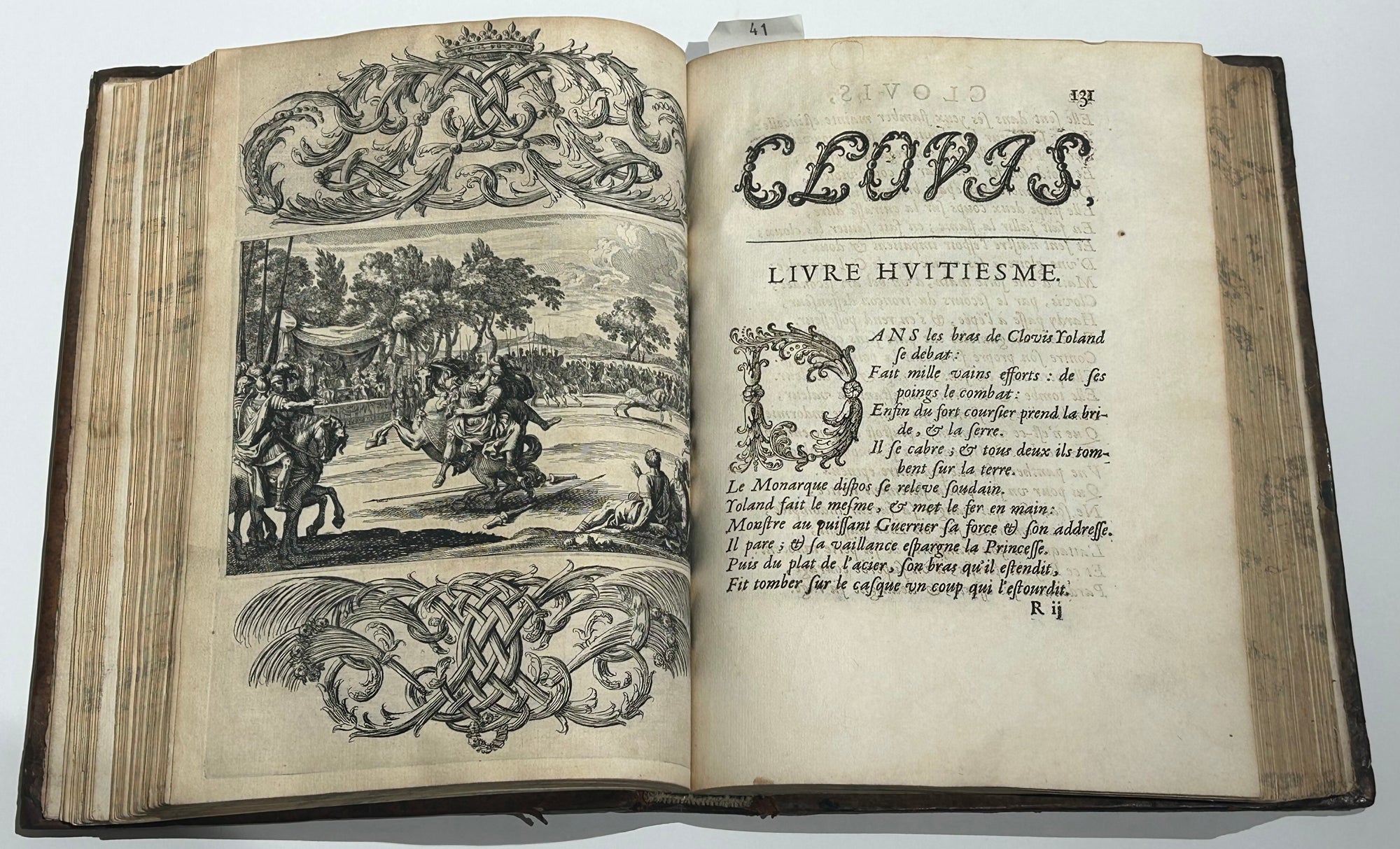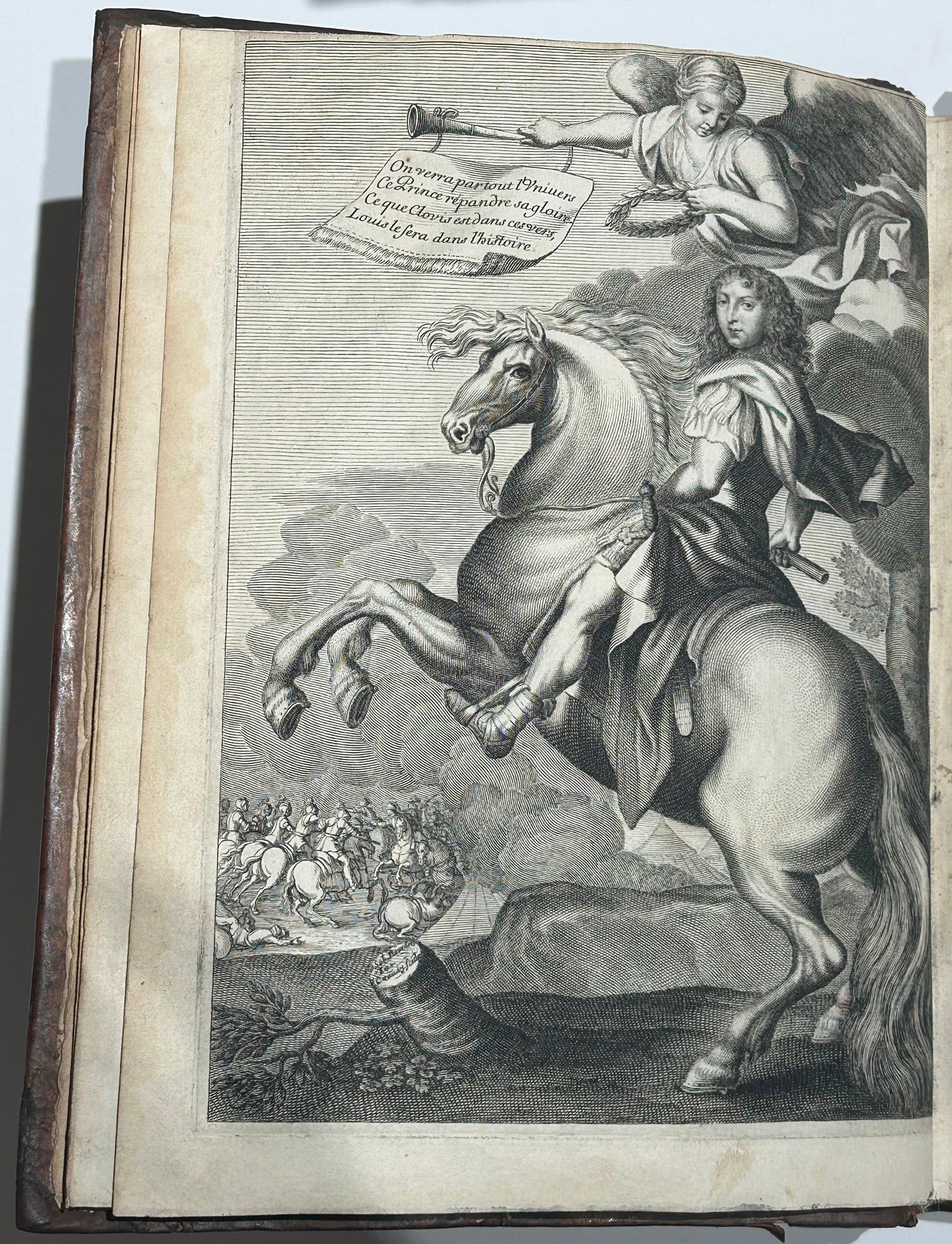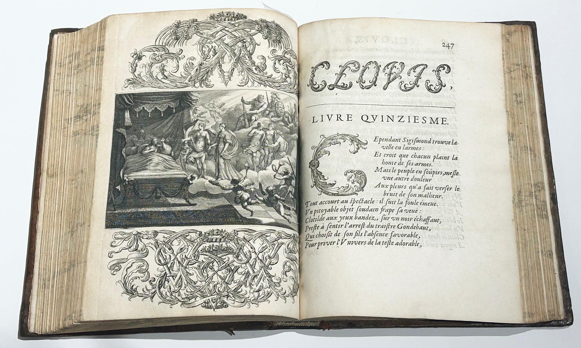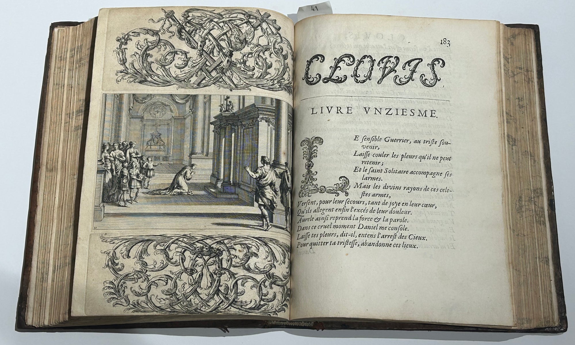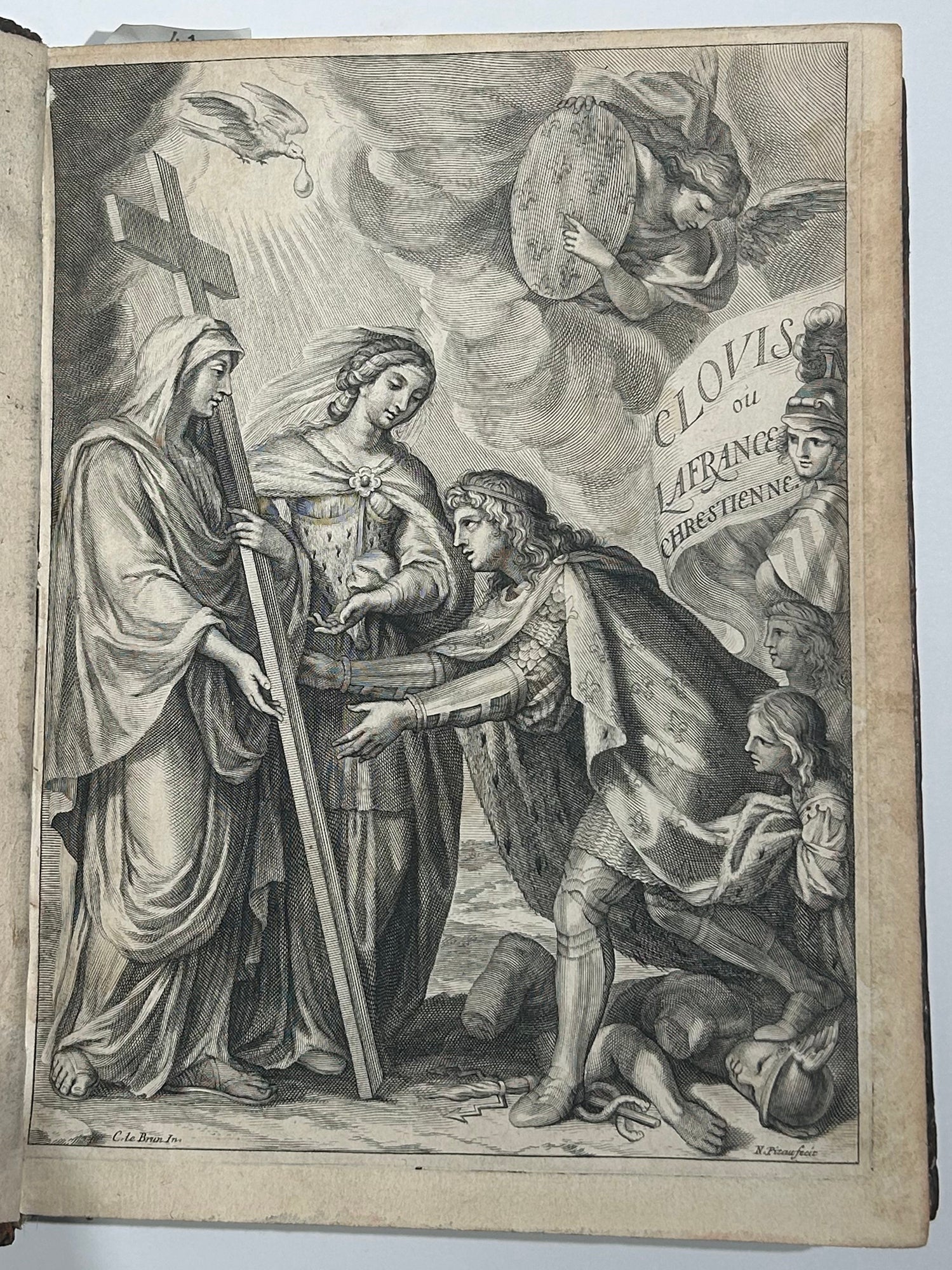 DESMARET de SAINT-SORLIN (Jean) Clovis ou la France Chrestienne. Poème héroïque. Paris, Augustin Courbé, Henry Le Gras, Jacques Roger, 1657. In-4 [260x190], reliure d’origine plein veau glacé tabac filets à froid, dos à nerfs orné. Edition originale. Frontispice d’après Charles Le Brun gravé au burin par Nicolas Pitau, 28 hors-texte gravées sur cuivre, 464pp. Texte imprimé en italiques, chaque livre débute par le titre du poème en lettres fleuronnées, répété, avec lettrines et culs-de-lampe à la fin, composés en cursive ornementale et gravés sur bois par Jean Papillon. Exemplaire bien conservé dans l’ensemble. Rare édition originale, illustrée d’un frontispice par N. Pitau d’après C. Le Brun, un portrait équestre de Louis XIV d’après Sébastien Bourdon, un grand monogramme couronné à pleine page gravé à l'eau-forte, et 26 planches hors texte d’Abraham Bosse (Tours 1602†1676) et François Chauveau (Paris 1613 † 1676), encadrées de chiffres entrelacés par Armand Desmarests, le frère de l'auteur. Cette édition offre le premier exemple de figures mêlées de chiffres dans l’histoire de la gravure en France. Exemplaires connus : 1 exemplaire de la même édition que la nôtre conservé à la BNF (inv.n° FRBNF30332832).