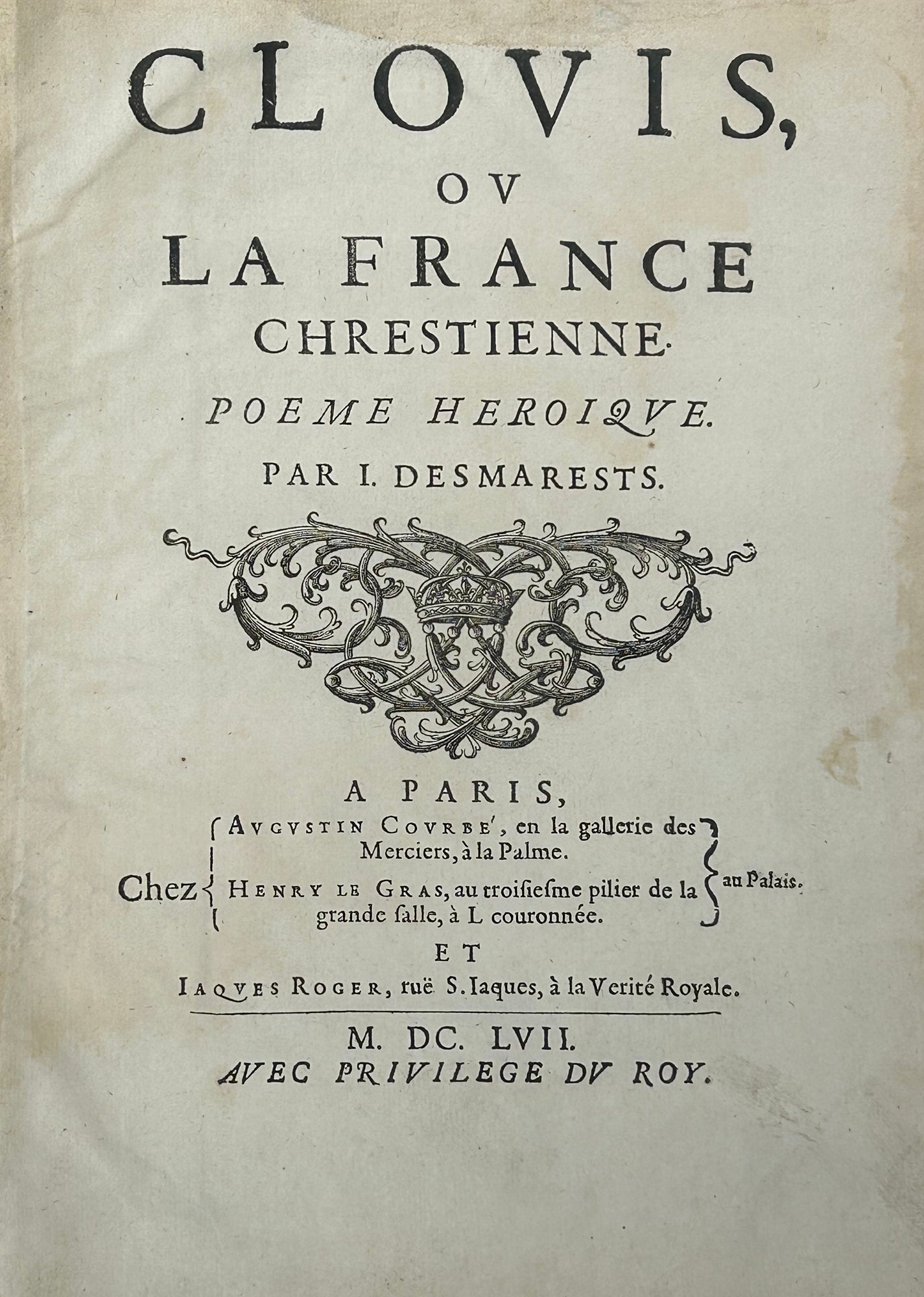 Les poèmes héroïques parus en France dans les années 1650 ont longtemps passé pour de pâles imitations d’Homère, de Virgile et de la Jérusalem délivrée. Poète et romancier, Jean Desmarets de Saint-Sorlin (1595-1676), protégé du cardinal de Richelieu, entra à l’Académie française en 1634 et en fut le premier chancelier. En 1657, Desmarets produisit son poème épique « Clovis ou la France chrétienne », en vingt-six chants (réduit à vingt chants en 1673). Ce long poème héroïque de plus de 11 000 vers, fruit d’une imagination débridée, exalte la monarchie française en la personne de son premier roi chrétien. « Clovis » est une œuvre importante du point de vue historique : véritable déclaration de guerre des Modernes contre les Anciens, c’est aussi la première épopée chrétienne (elle sera suivie par « La Pucelle » (1655) de Chapelain, « Saint-Louis » (1670) du Père Le Moyne…), et l’un des premiers textes français à puiser son inspiration dans l’histoire du christianisme. Cet ouvrage fut beaucoup loué par Jean Chapelain et lui valut les sarcasmes de Boileau, qui était hostile à l'introduction du merveilleux chrétien dans la poésie épique.