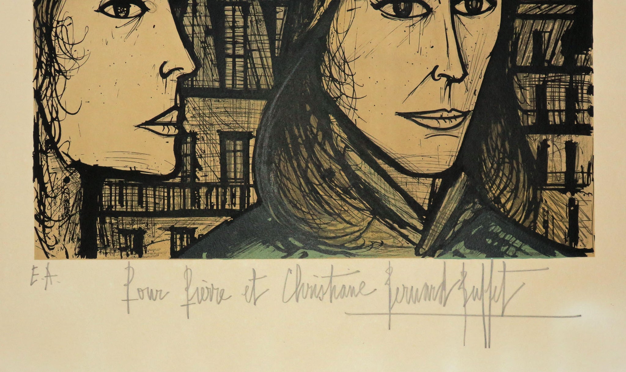 Signée en haut à droite dans la composition. Belle épreuve d'artiste, sur papier vélin Rives, signée et dédicacée "Pour Pierre (Bergé) et Christiane (sa maman)" au crayon. Bonnes marges. Provenance: Collection Pierre Bergé. Agé de vingt ans, Pierre Bergé rencontre le peintre Bernard Buffet dont il devient le compagnon et accompagne la carrière pendant huit ans. Les deux hommes s'étaient rencontrés dans un café Rue de Seine et vécurent une histoire d'amour fusionnelle jusqu'à ce que Pierre Bergé parte pour Saint Laurent. En 1958, Pierre Bergé rencontre Yves Saint Laurent dans des sorties parisiennes. Ensemble ils créeront la maison de couture si célèbre aujourd'hui. Amoureux des œuvres d'art, les deux hommes étaient de grands collectionneurs. |