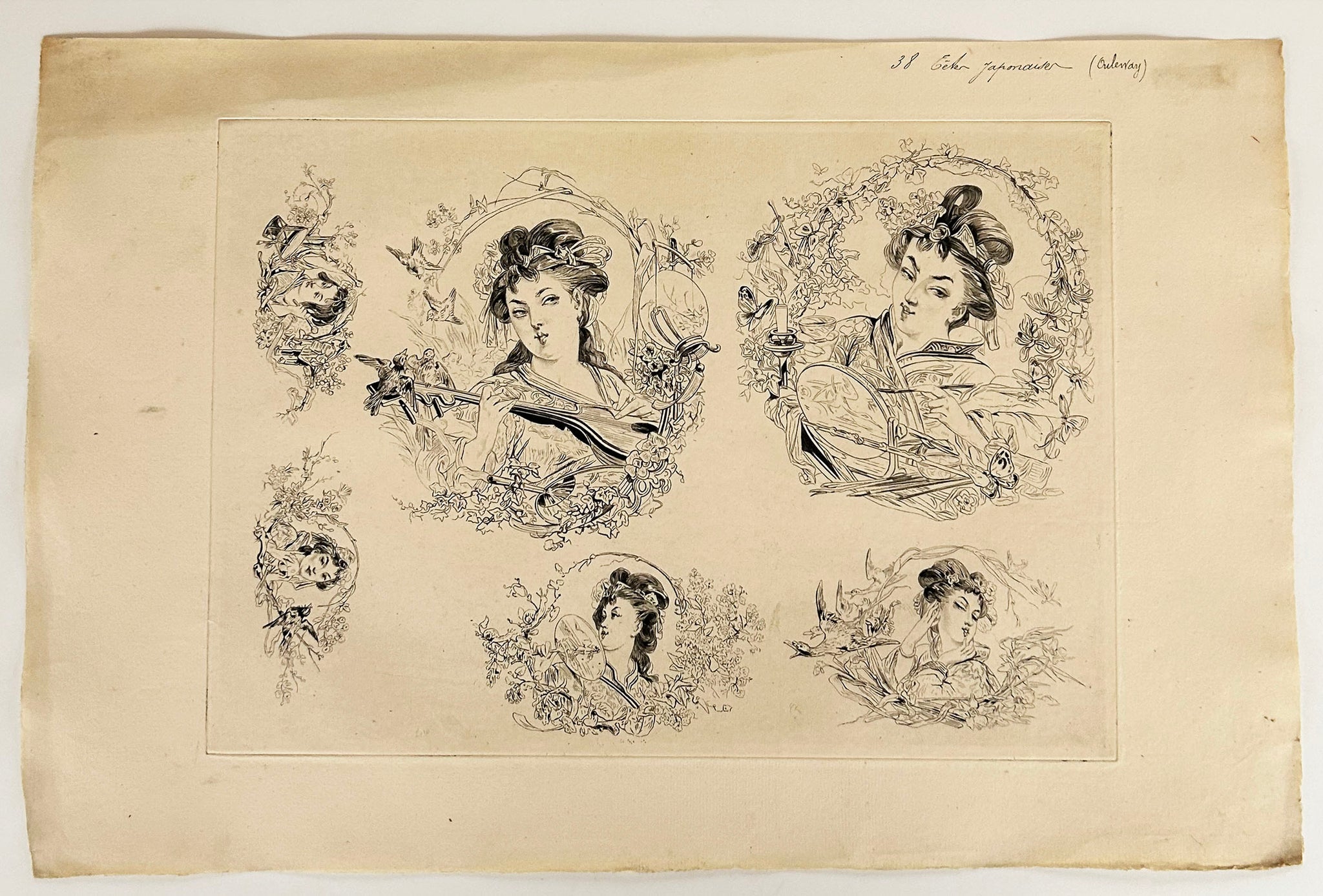 Epreuve sur papier vergé D&C, annotée "38 Têtes japonaises (Oulevay)" à l'encre brune en marge supérieure. Toutes marges. Bel état de conservation. Planche destinée à être reportée sur faïence. |
