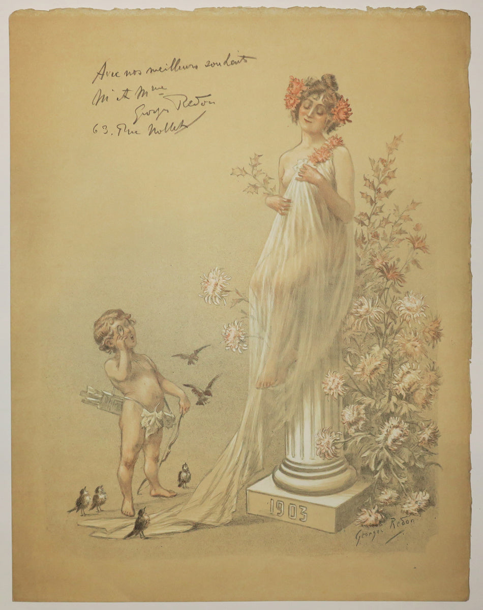 "Avec nos meilleurs souhaits M et Mme Georges Redon, 63 rue Nollet". (Jeune femme assise sur une colonne datée 1903 admirée par Cupidon).