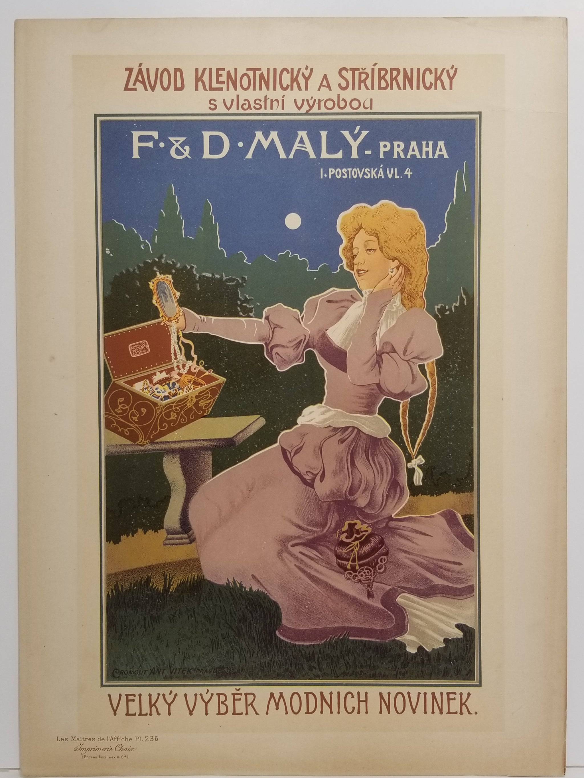 Planche n°236 du cinquième volume annuel (1900) des Maîtres de l'affiche. Épreuve portant le timbre sec des Maîtres de l'Affiche dans le coin inférieur droit (Lugt : L.1777c ), imprimée chez Chaix (Ateliers Chéret) rue Bergère à Paris. Composition créée pour une Maison de Bijouterie de Prague. |