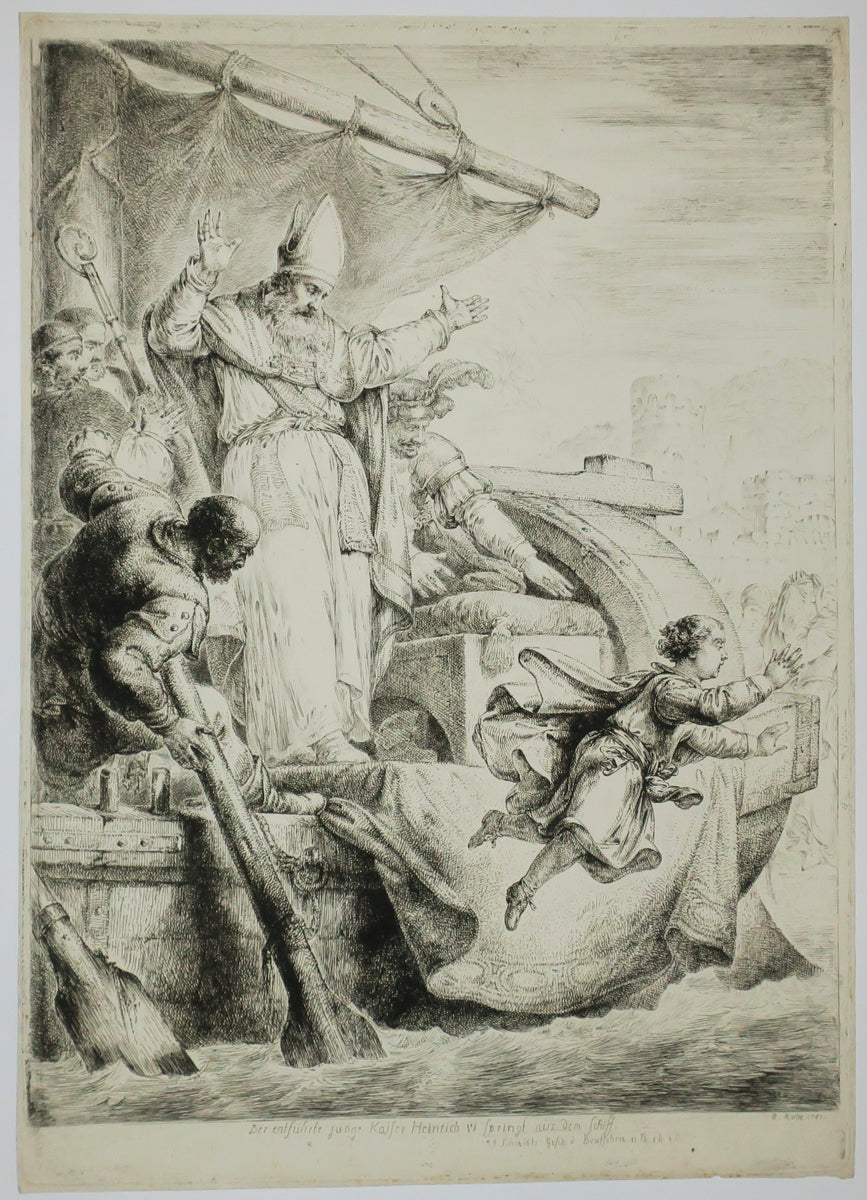 Signée, datée et titrée "Der entführte juge Kaiser Heinrich VI Springt aus dem Schiff" à la pointe dans la tablette. Epreuve, à petites marges, portant au verso la marque de collection de L.A. de Vries, Lugt non décrit. |