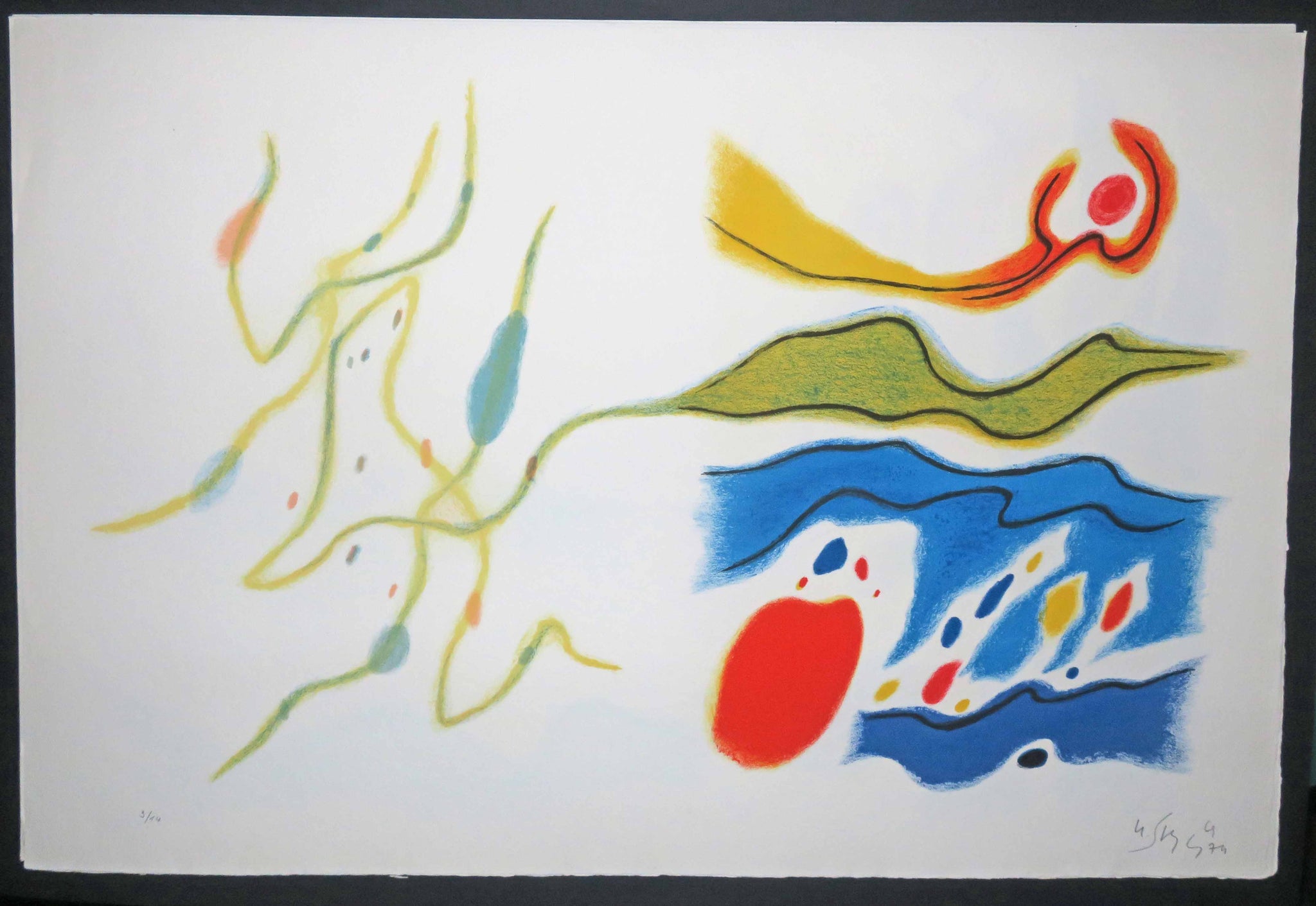Planche pour "Le Blason du corps blessé, Poème de Jean Lescure" (comportant 18 lithographies de l'artiste Singier), 1974. Très belle épreuve d'un tirage avant lettre, sur papier vélin Richard, numérotée 3/14, datée et signée au crayon par l'artiste.Très bel état de conservation. |