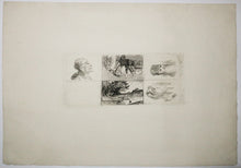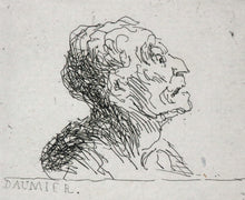 Belle et rare épreuve d’essai antérieure au tirage pour l’ouvrage de Champfleury, Catalogue de l’œuvre lithographié et gravé de H. Daumier, 1878. Honoré Daumier fut l'un des plus grands maîtres de la lithographie mais on lui doit qu'un seul essai d'eau-forte. Celui-ci date du 29 mai 1872 et regroupe sur une même planche quelques croquis par Rops, Harpignies et Taiée. |