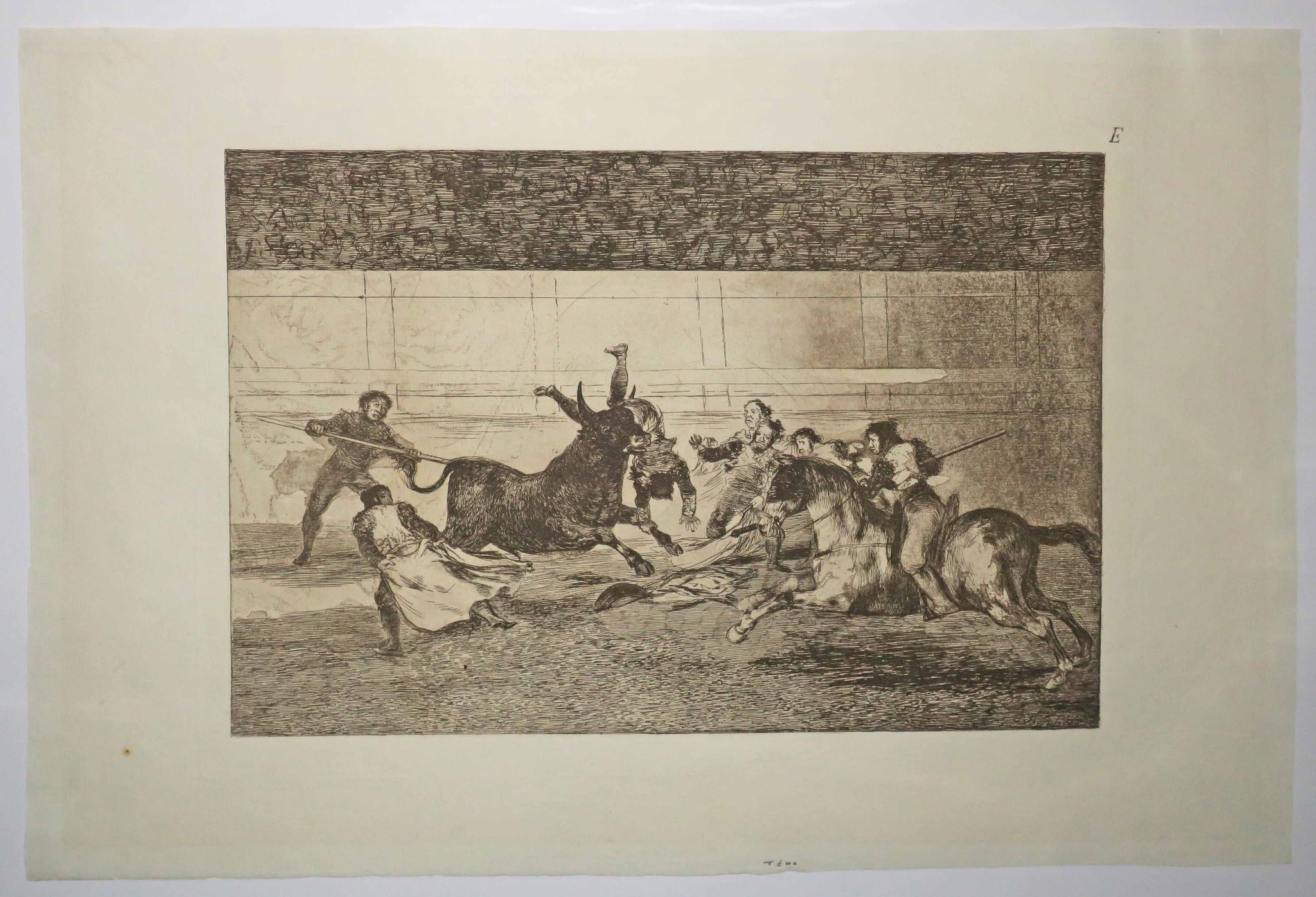 Signée "Goya" à la pointe en bas à droite dans la composition. Planche additionnelle "E" de la suite "La tauromachie". Belle épreuve sur papier vergé Arches. Marges. |