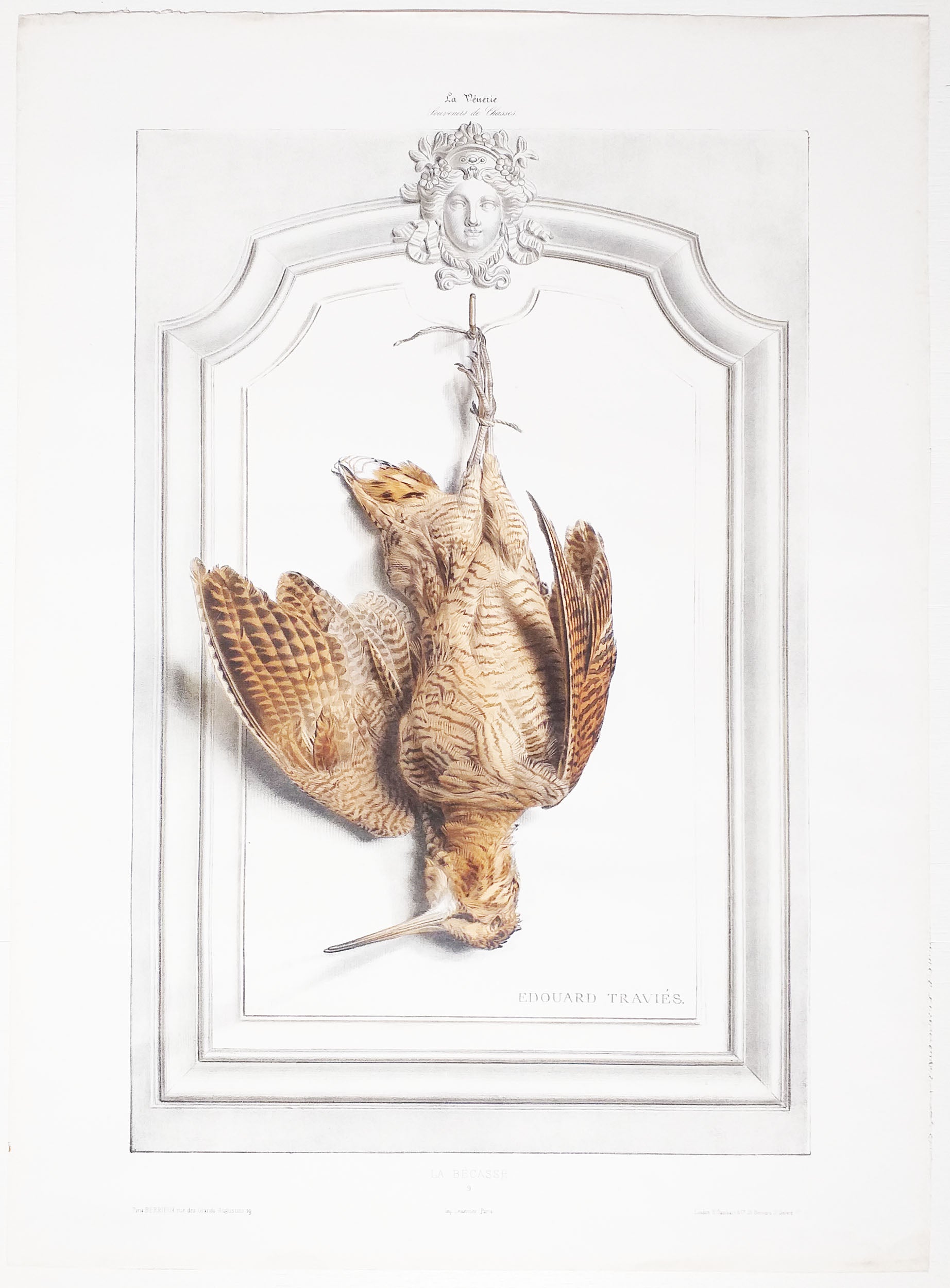 Après avoir commencé dans la caricature, Édouard Traviès se spécialise dans la peinture d’oiseaux et d’insectes peints à l’aquarelle. Il expose régulière au Salon entre 1831 et 1866. Il réalise de nombreuses lithographies pour "La vènerie. Souvenirs de chasse", et une série de douze trophées pour le "Musée du chasseur".