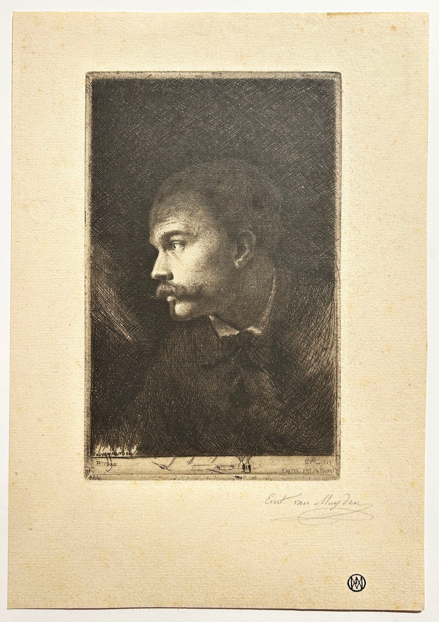 Signée à la pointe en bas à gauche dans la planche. En bas à gauche dans la tablette:"E. Van Muyden / p. 1890"; en bas à droite:" EVM 1889 / d'après phot. Rome". Epreuve sur papier vergé filigrané (lettres), avec des petites remarques gravées à la pointe représentant les outils du graveur, contresignée au crayon gris par l'artiste. Revêtue d'une marque de collection non décrite par Lugt. Marges. Le Musée d'Art et d'Histoire de Genève conserve une épreuve similaire à la nôtre (iii/iv) (inv. n°E 2019-0796). |