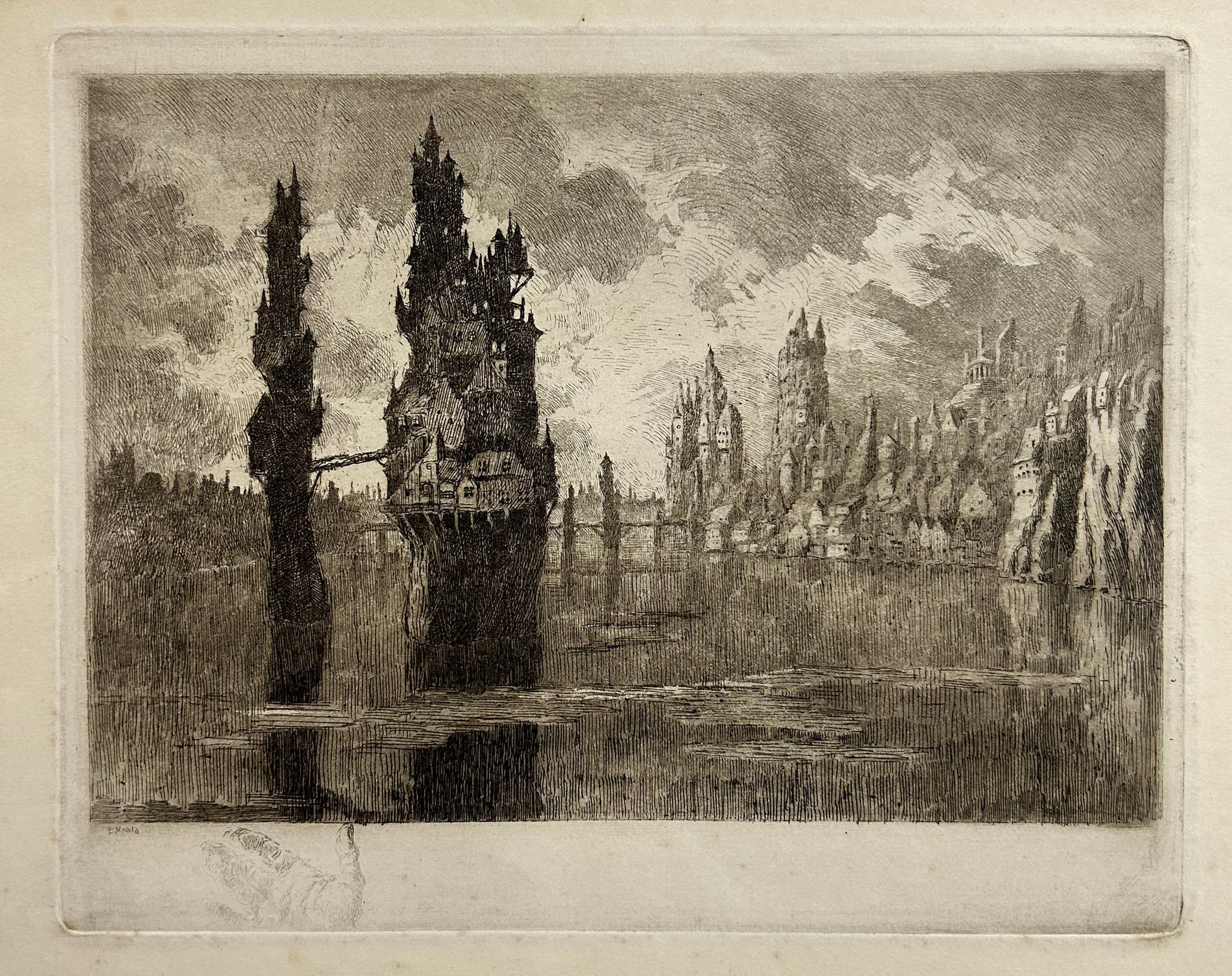 Epreuve du 1er état sur 3, avant les trois personnages ailés dans le ciel et encore avec la remarque (main) gravée dans la tablette, sur papier vélin.
