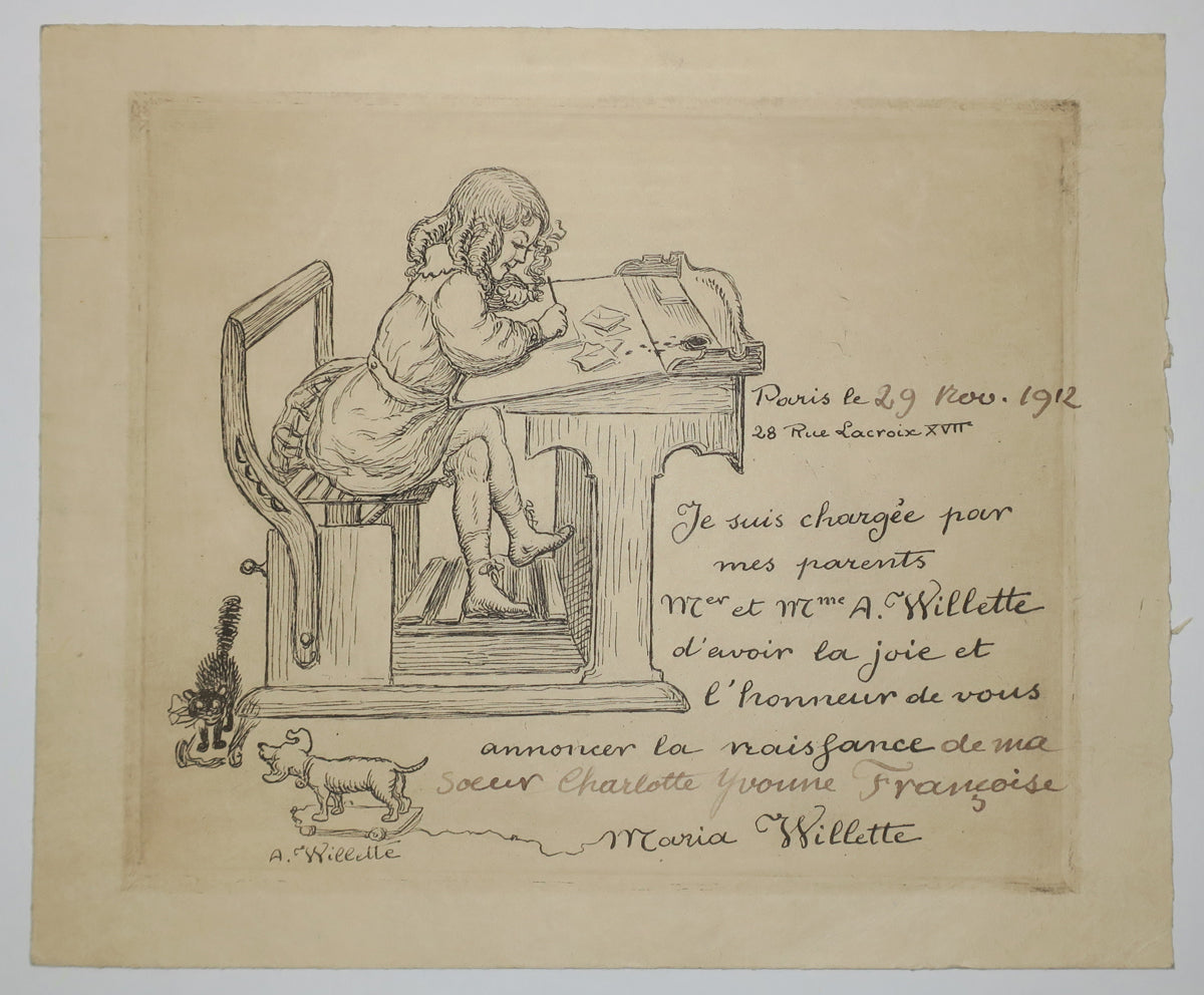 | Date et nom du nouveau-né manuscrits à l'encre brune. Signé à la pointe dans la composition. Marges. Bel état de conservation. |